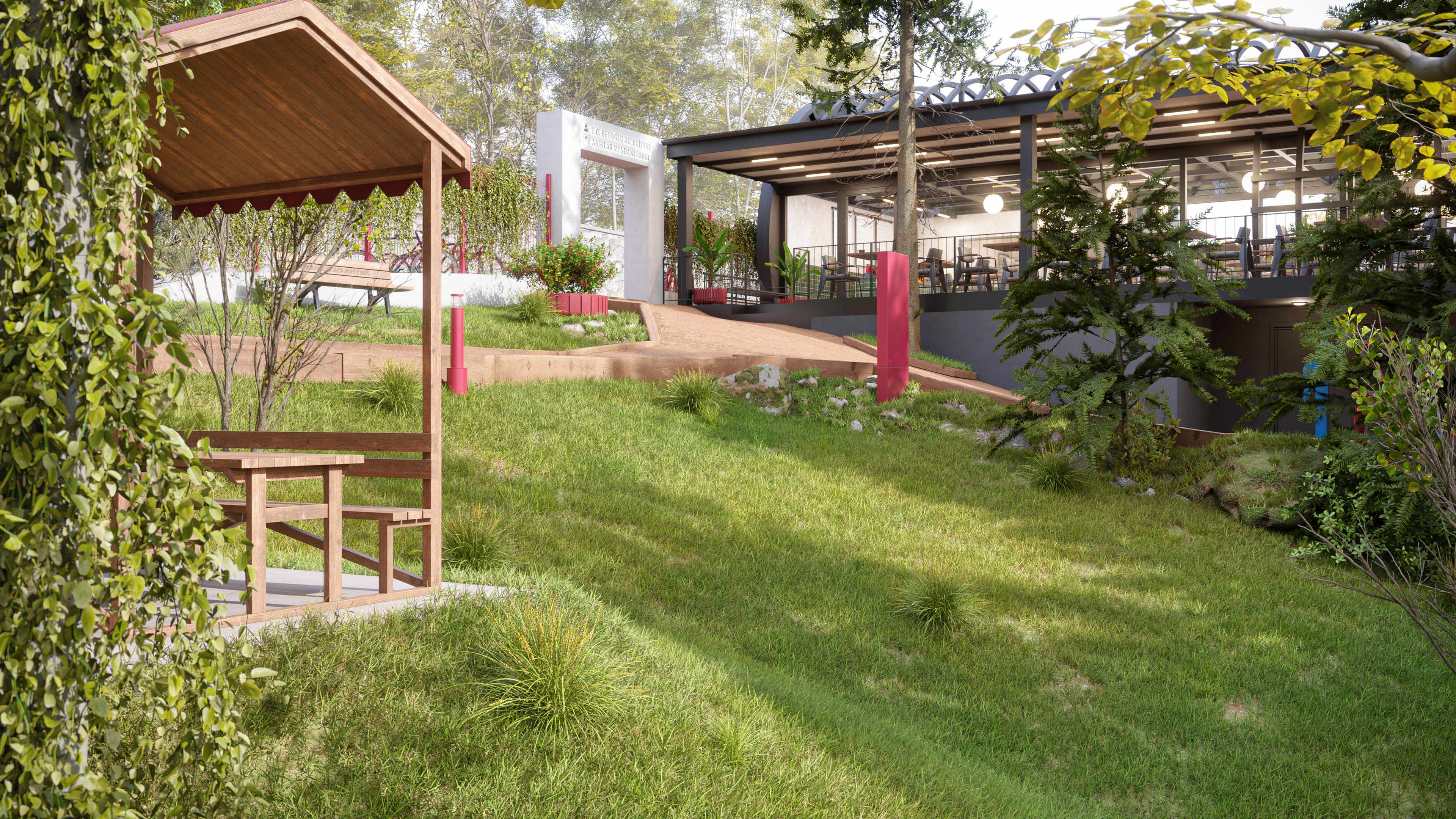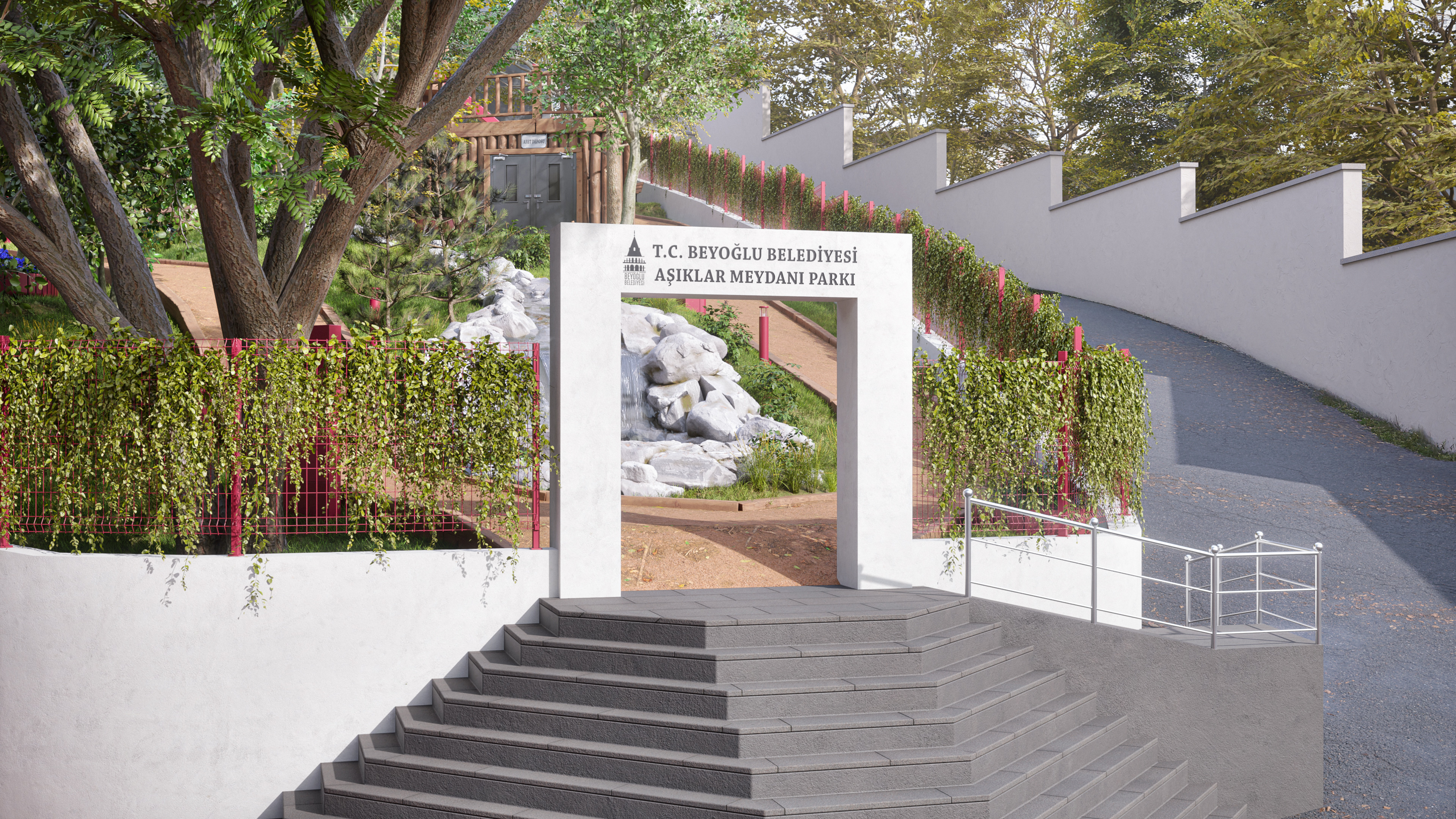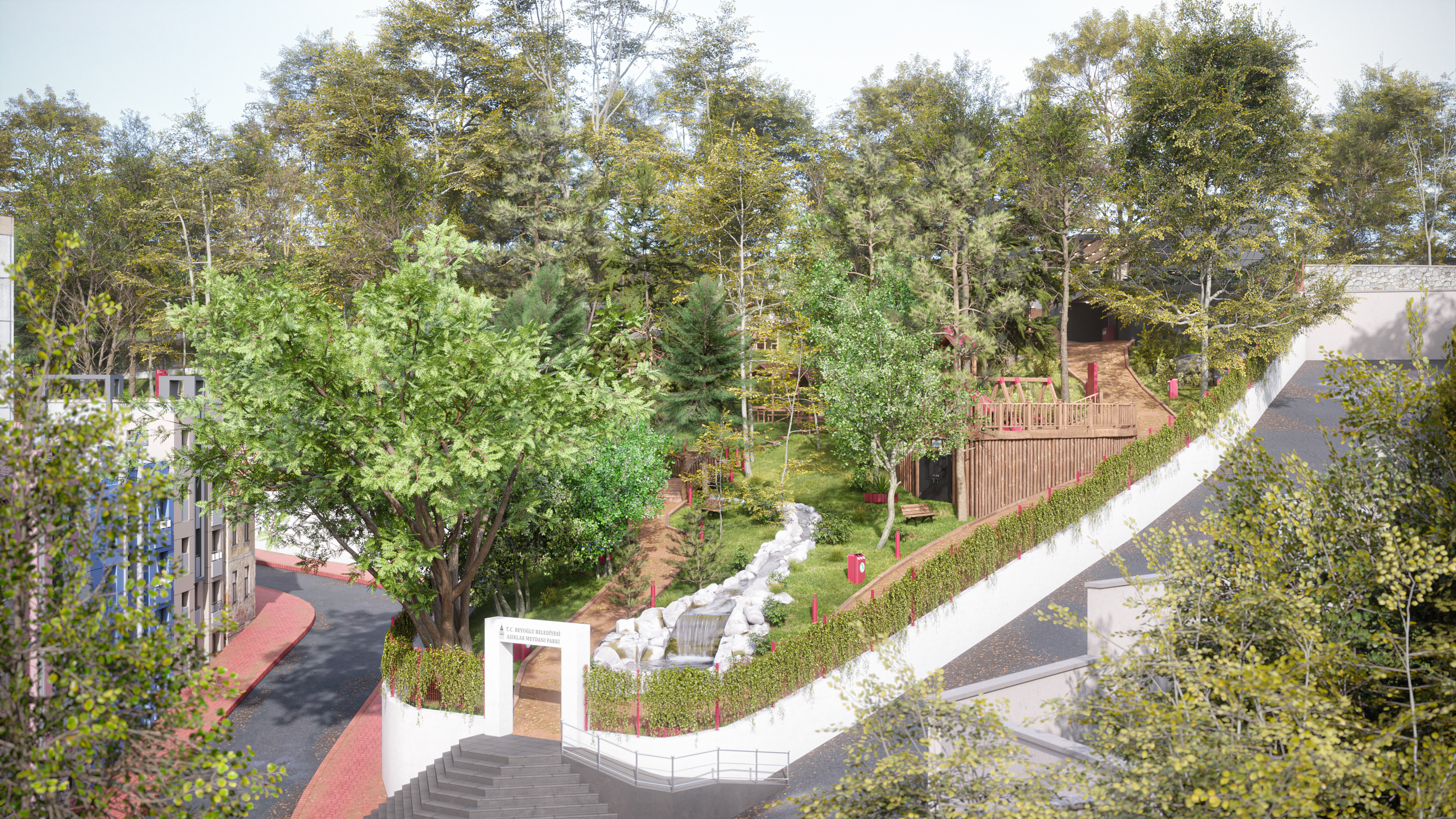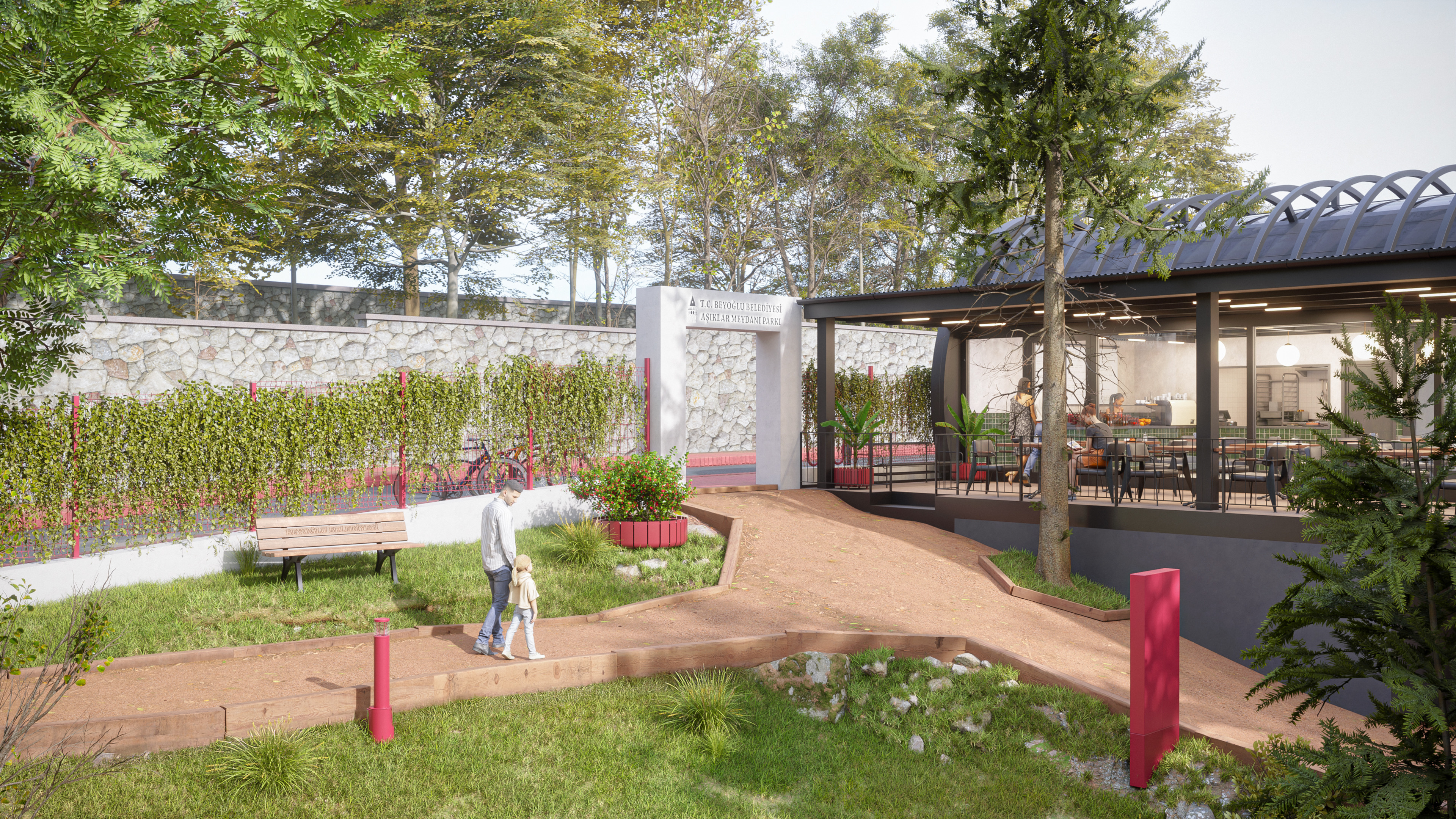 This design represents the third and final park concept created for the same site in the Beyoğlu district of Istanbul. Unlike the original version, which featured a historically inspired social facility and library, this alternative focuses on a more practical and cost-effective approach. The social facility and library were replaced with a smaller cafe, and the surrounding stone walls were redesigned as open wire fences to create a lighter, more transparent look.