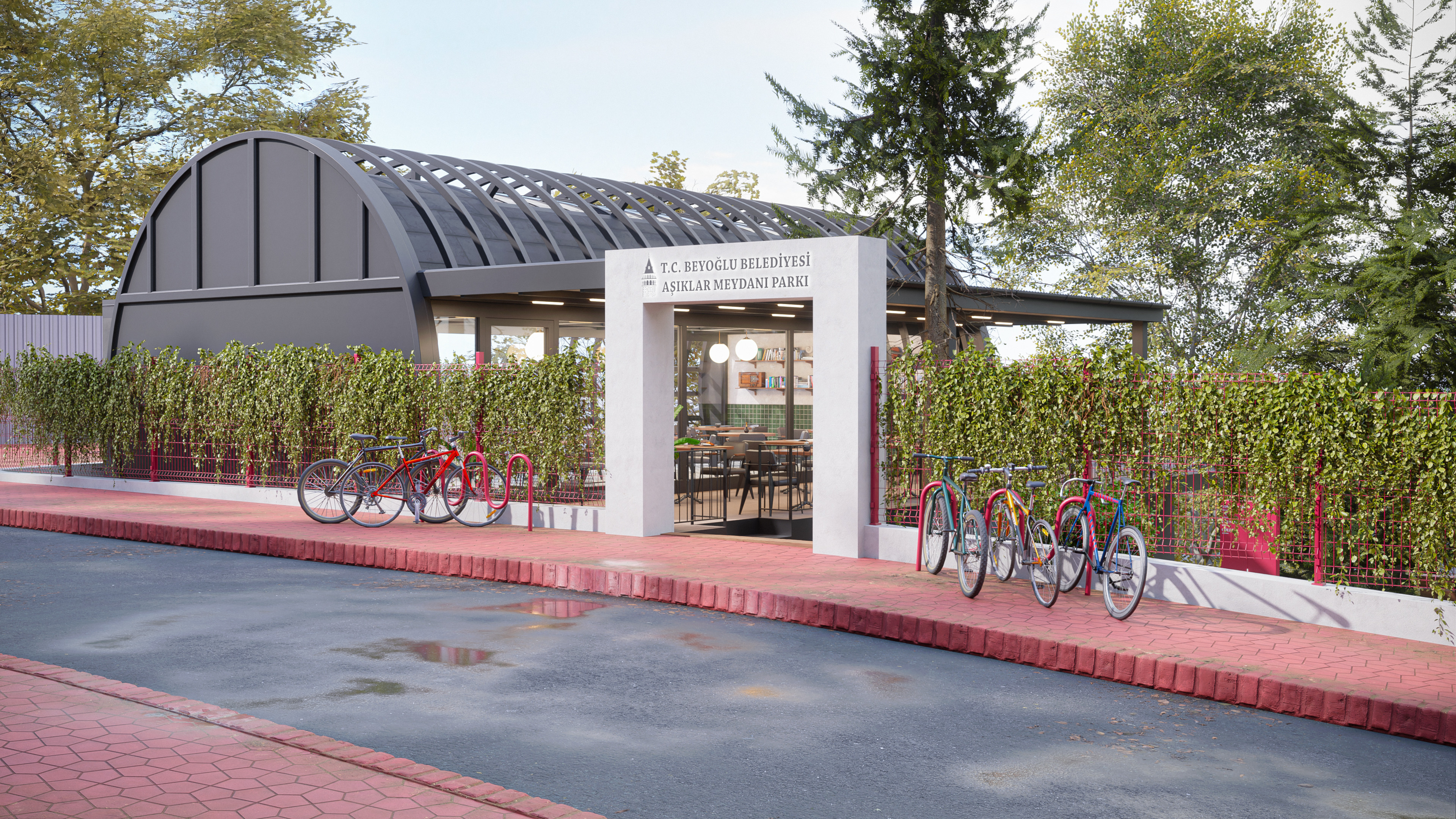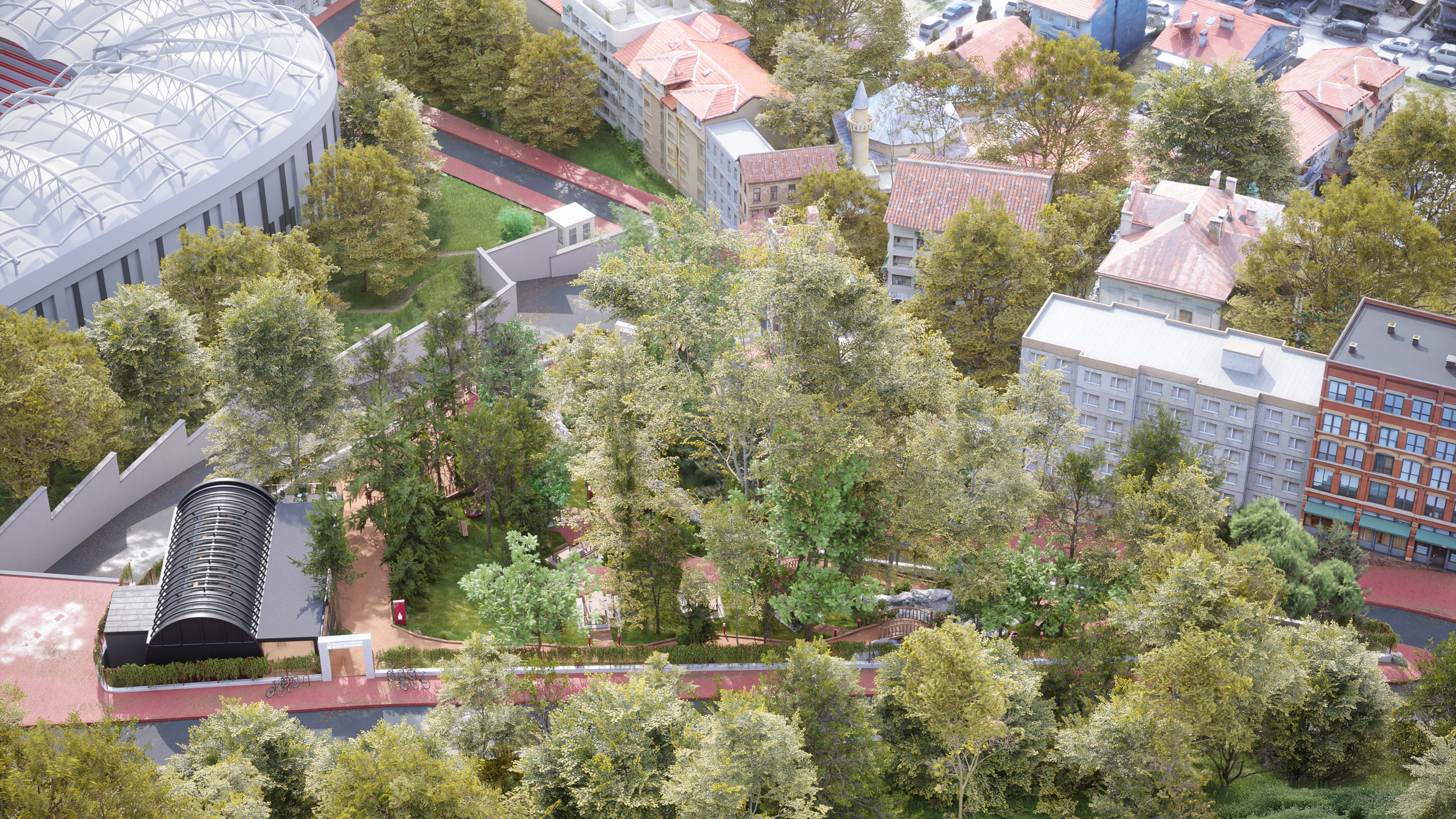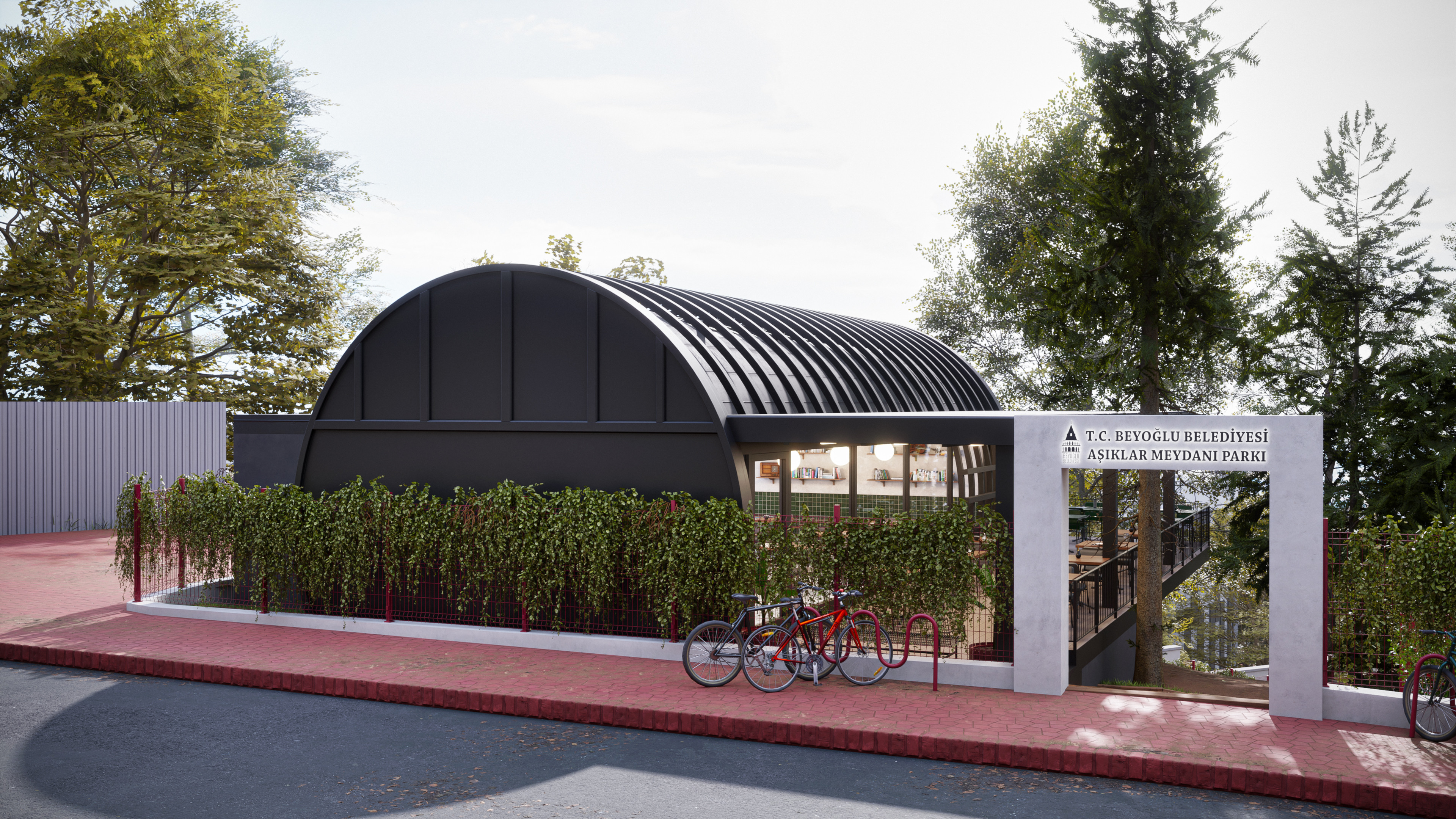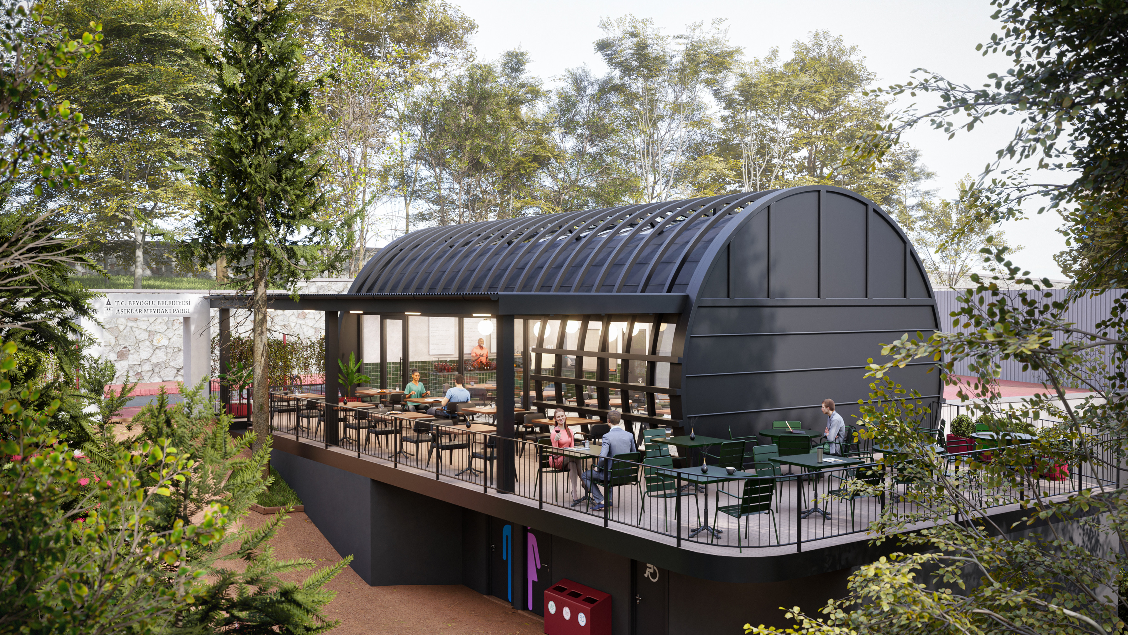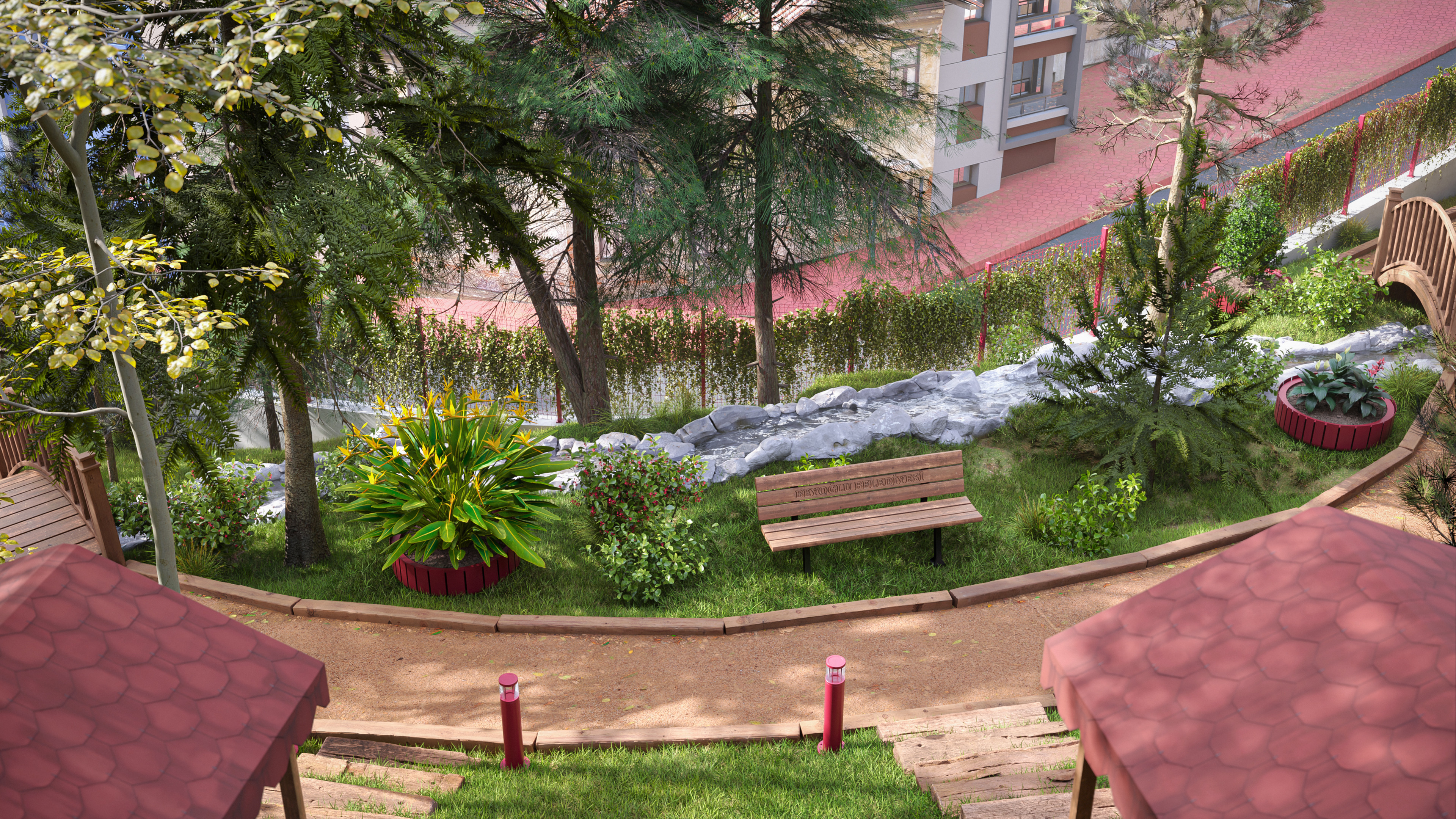 This design represents the third and final park concept created for the same site in the Beyoğlu district of Istanbul. Unlike the original version, which featured a historically inspired social facility and library, this alternative focuses on a more practical and cost-effective approach. The social facility and library were replaced with a smaller cafe, and the surrounding stone walls were redesigned as open wire fences to create a lighter, more transparent look.