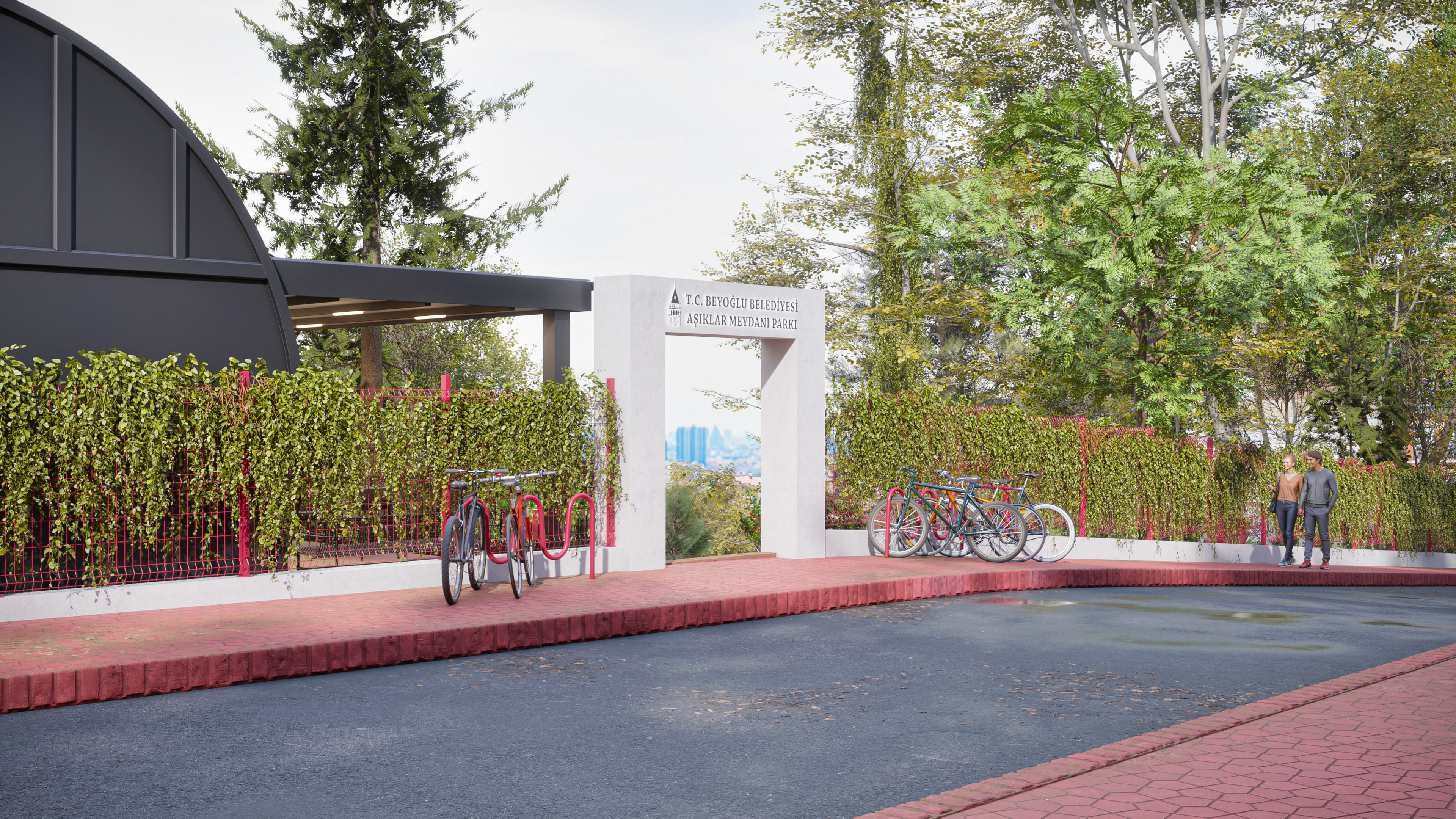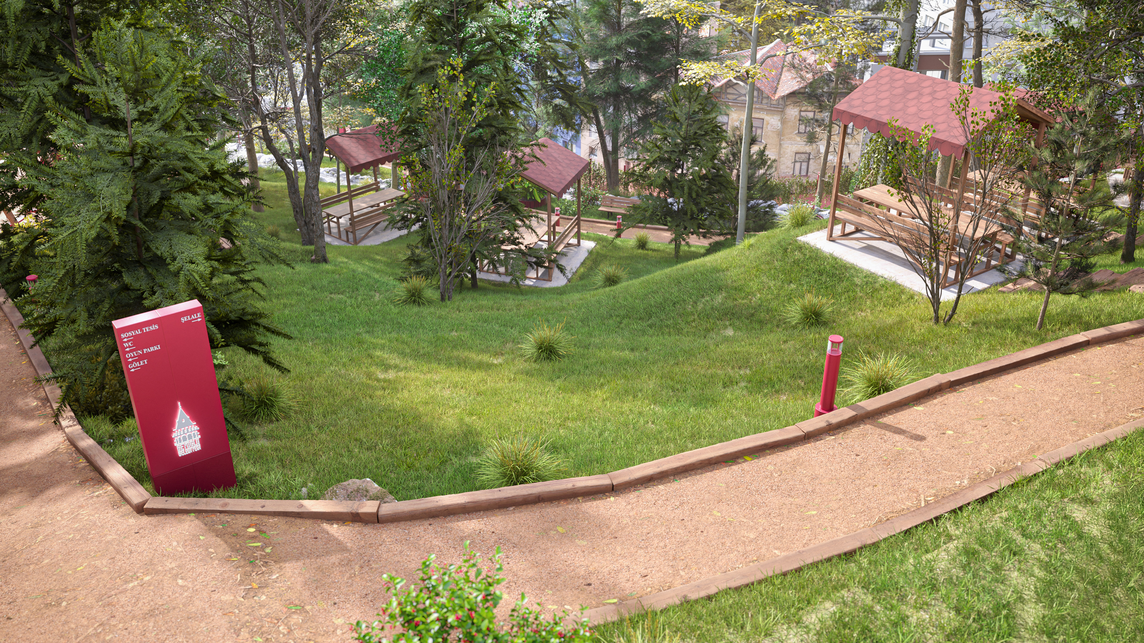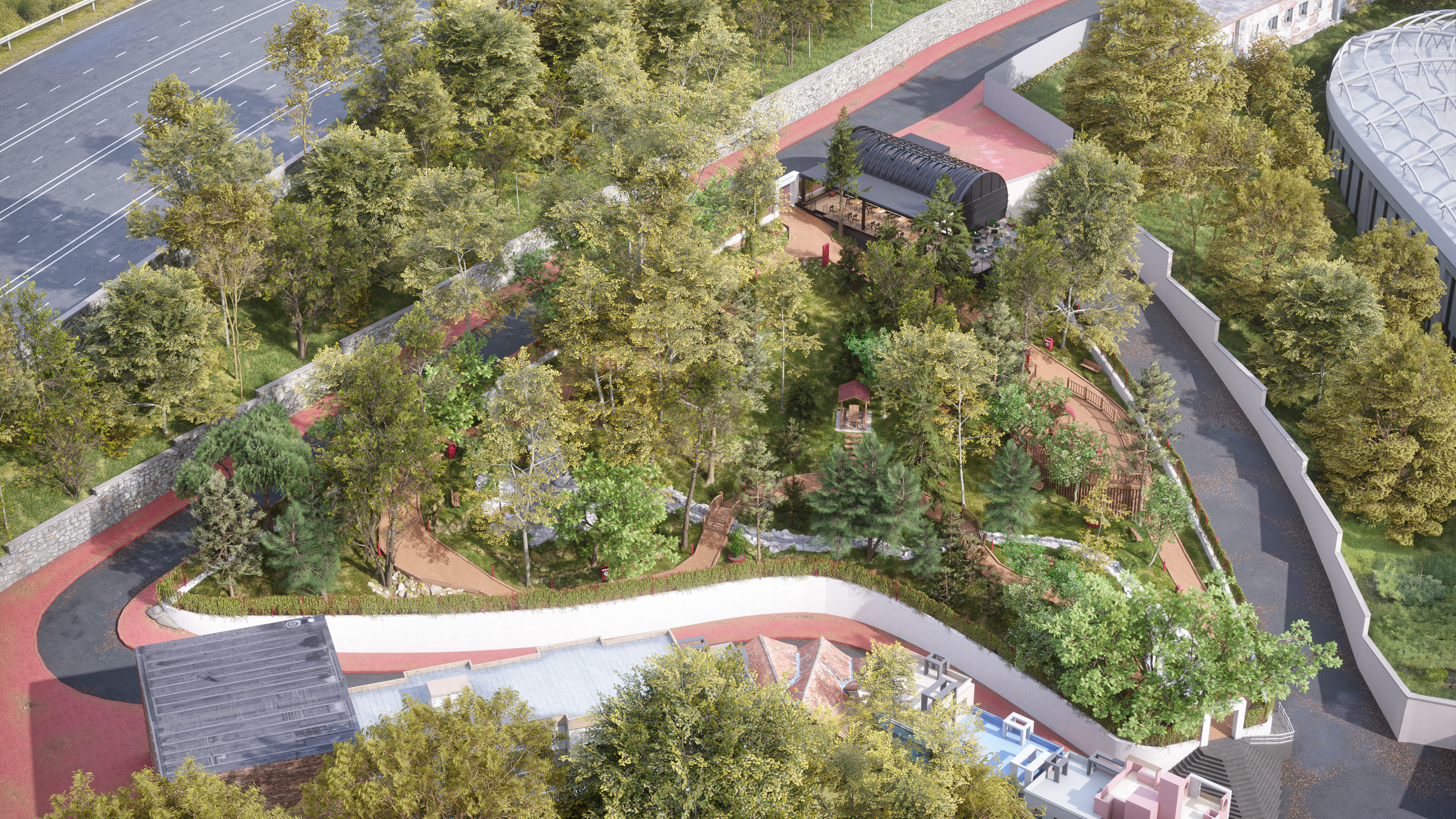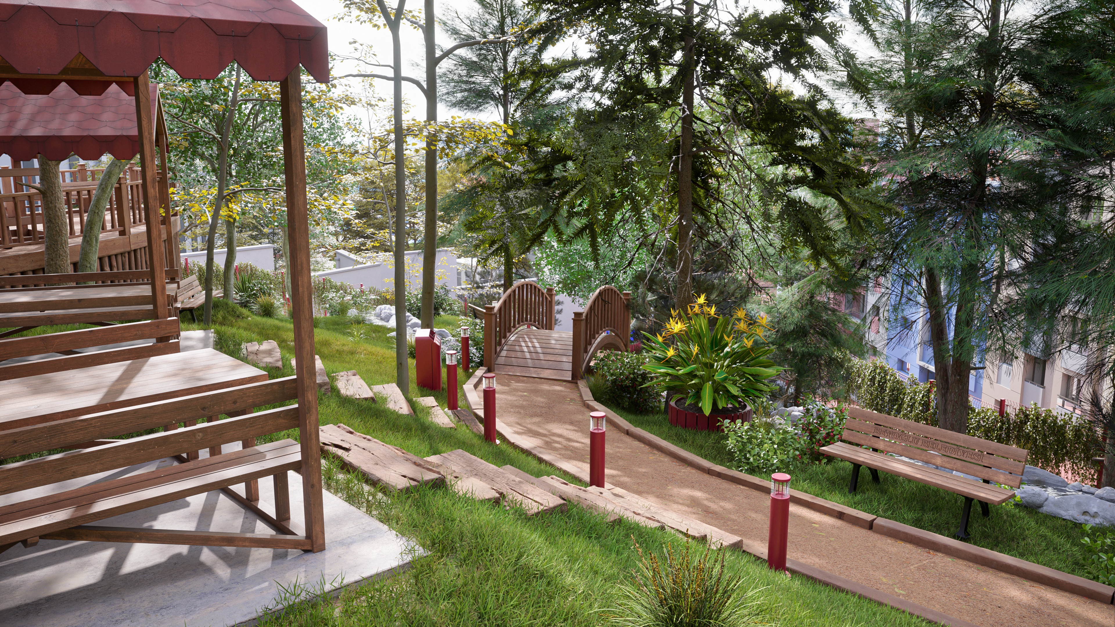 This design represents the third and final park concept created for the same site in the Beyoğlu district of Istanbul. Unlike the original version, which featured a historically inspired social facility and library, this alternative focuses on a more practical and cost-effective approach. The social facility and library were replaced with a smaller cafe, and the surrounding stone walls were redesigned as open wire fences to create a lighter, more transparent look.