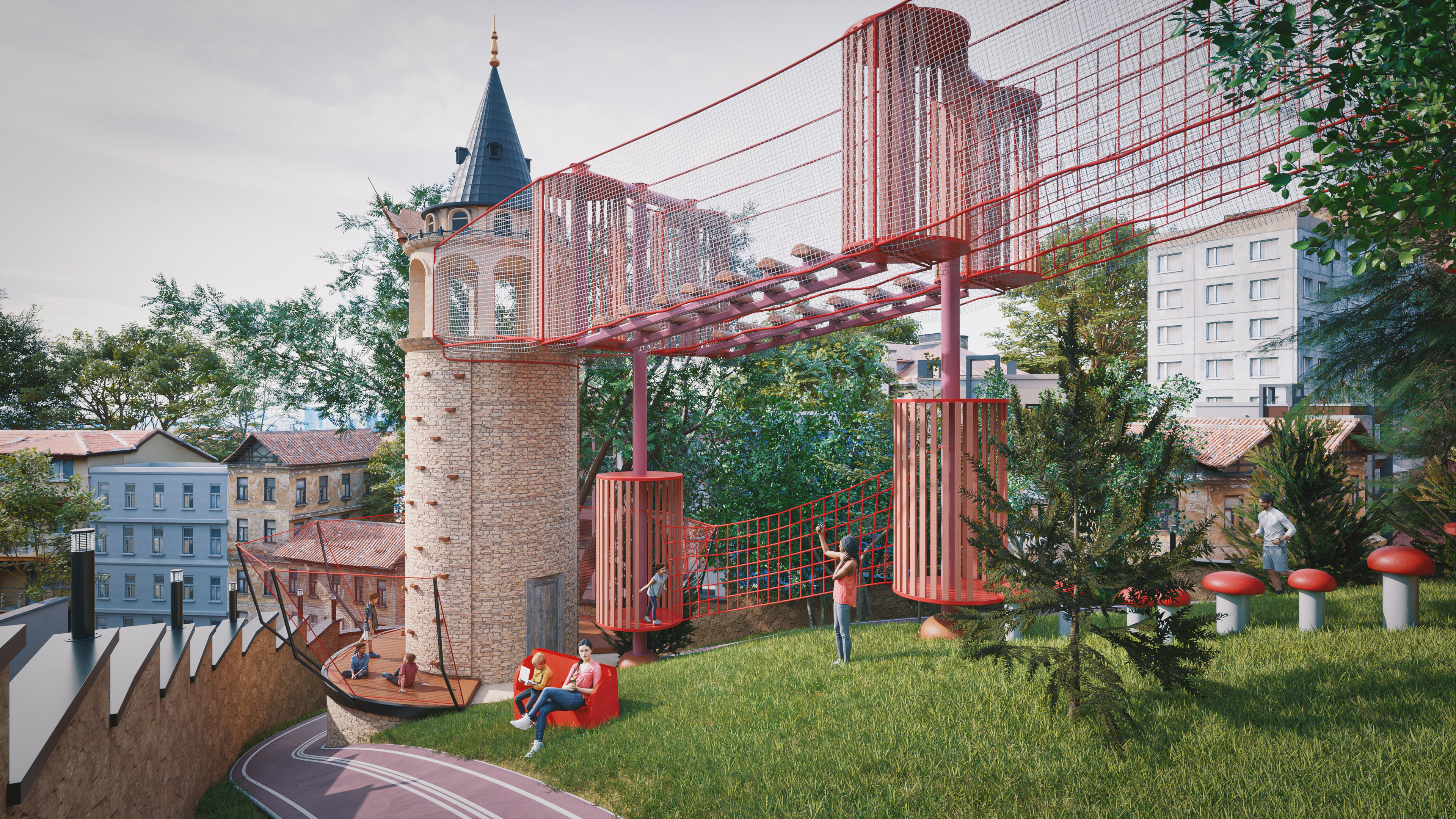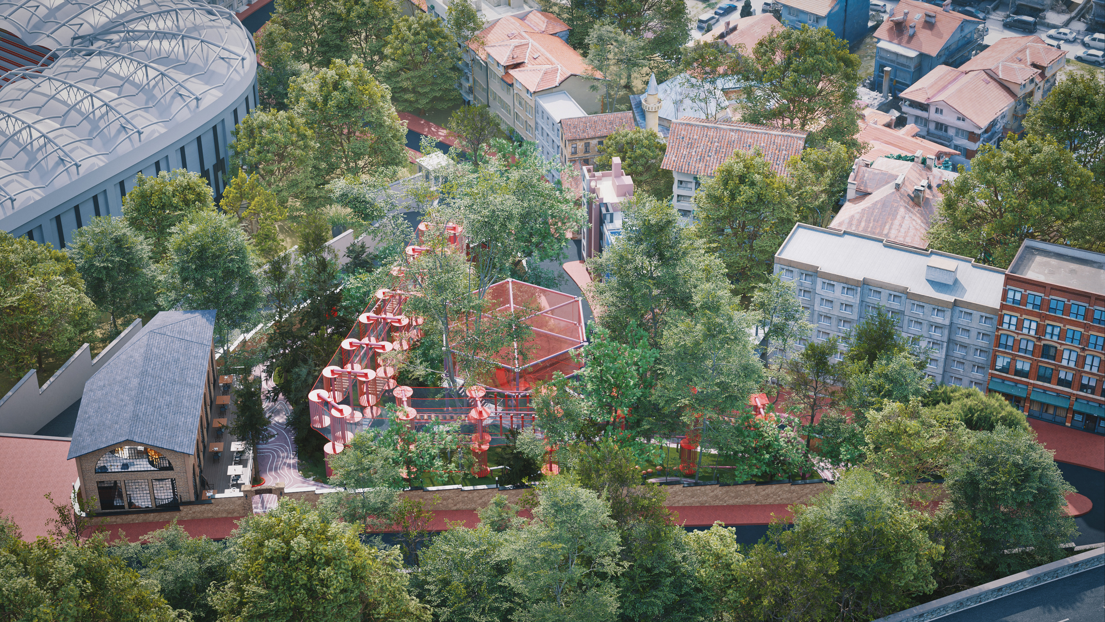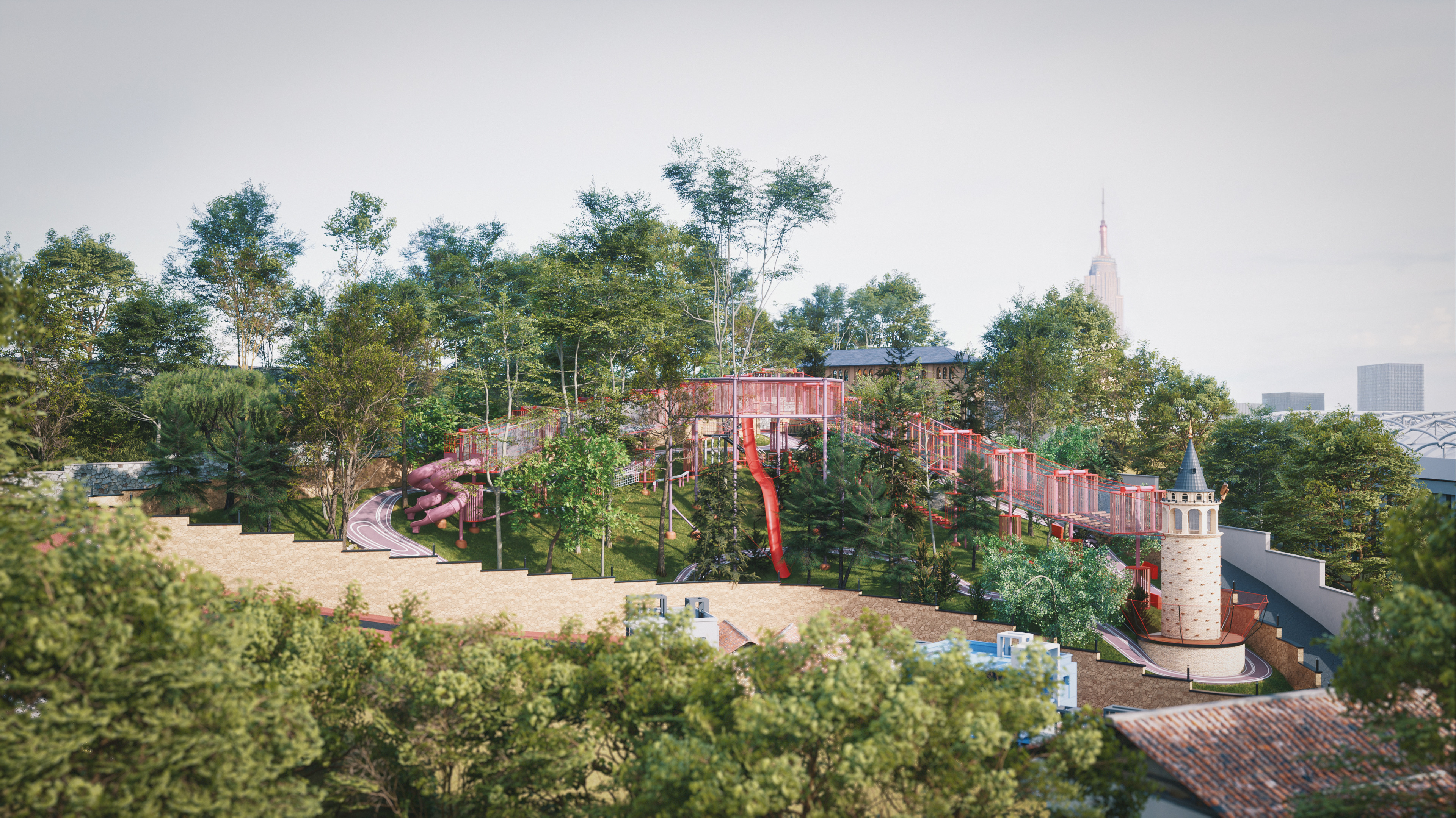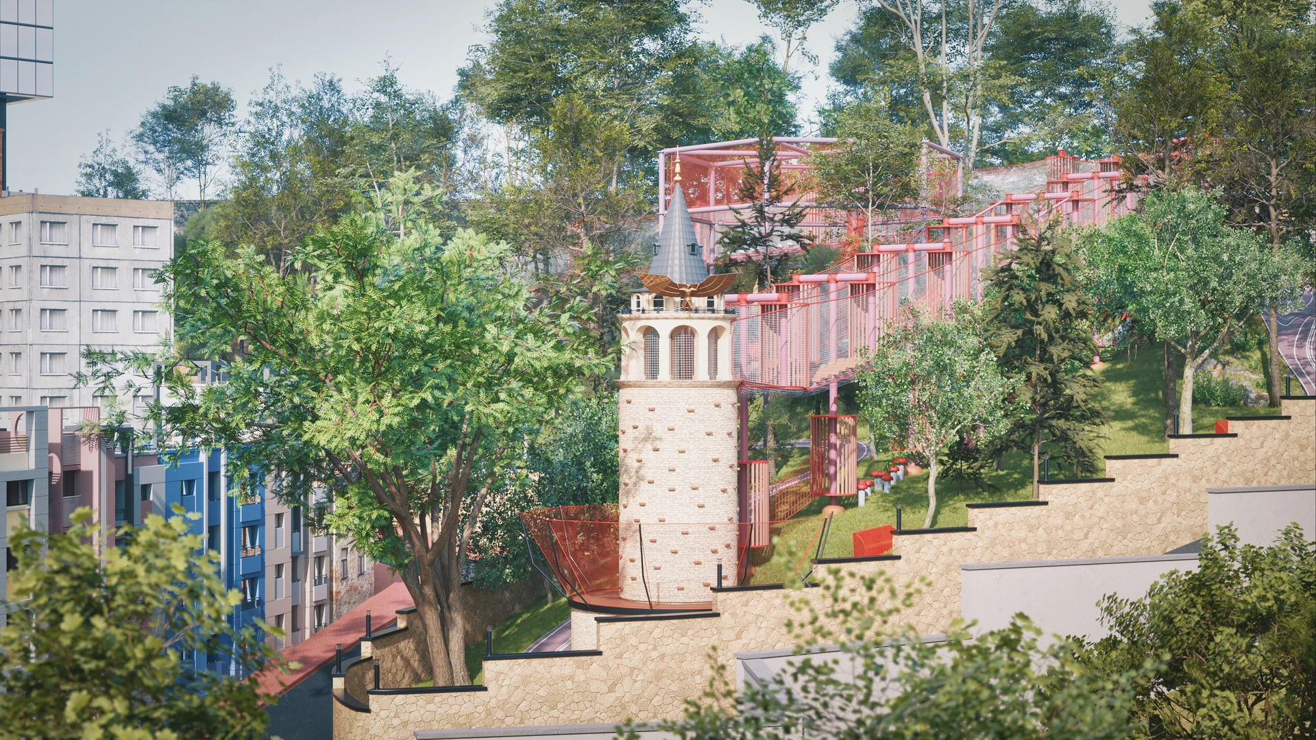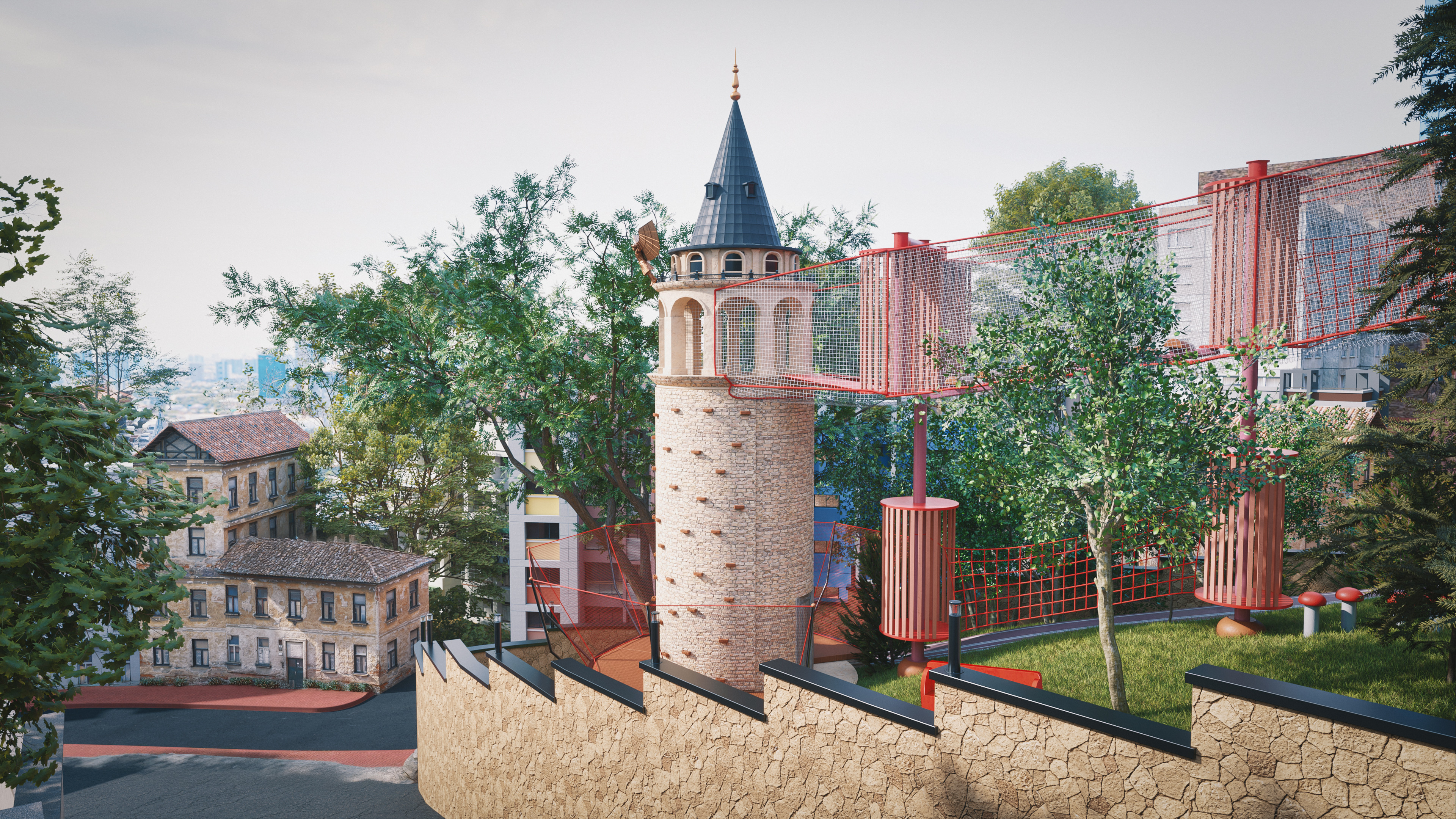 This project represents one of the alternative park concepts developed for the same site in the Beyoğlu district of Istanbul. It was designed as an adventure park that blends recreation and social interaction with nature, without cutting down trees or harming the existing landscape. The project includes a social facility, library, cafe, walking paths, resting areas, and a children’s adventure zone featuring a climbing wall designed as a stylized replica of the Galata Tower.