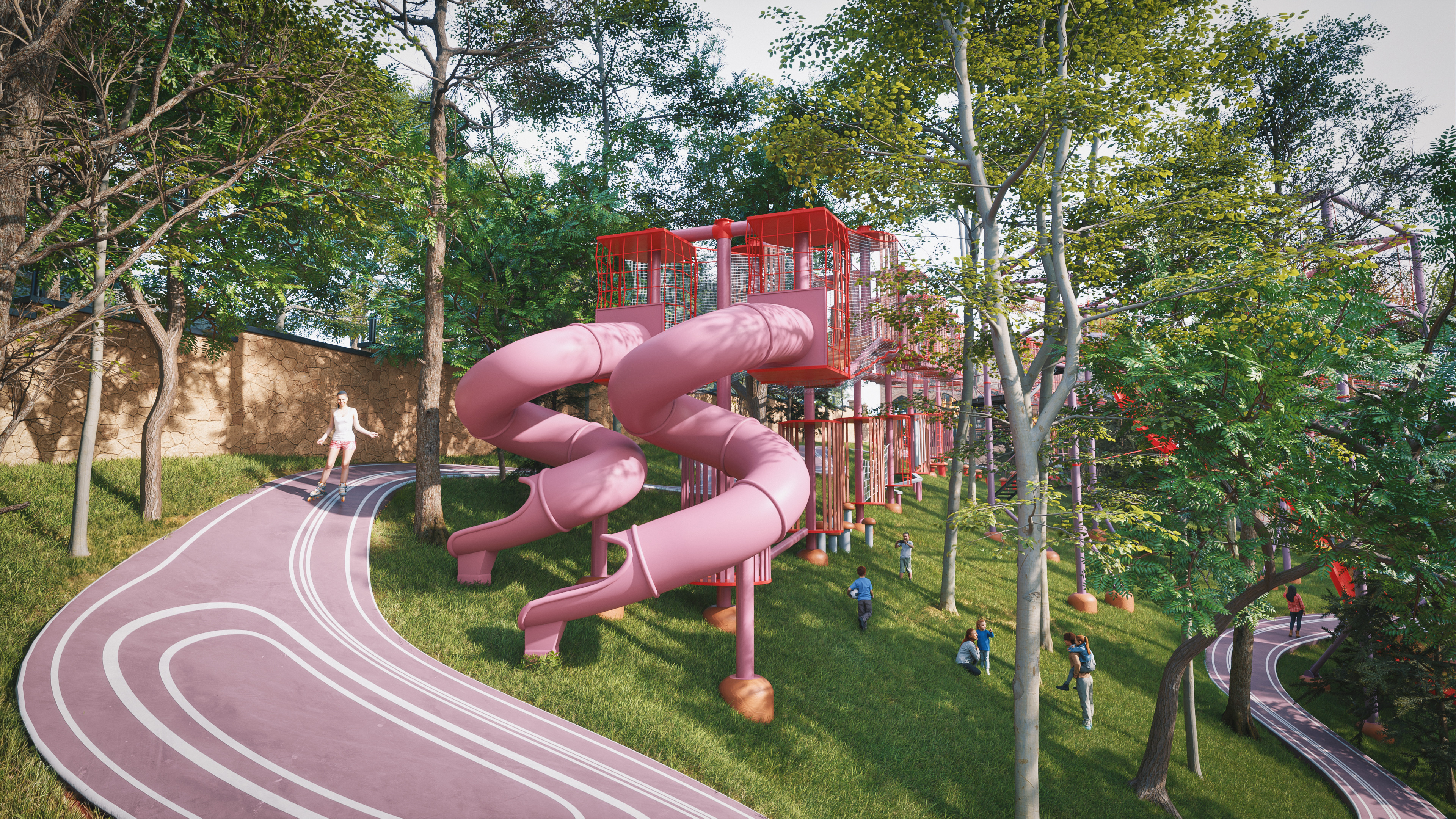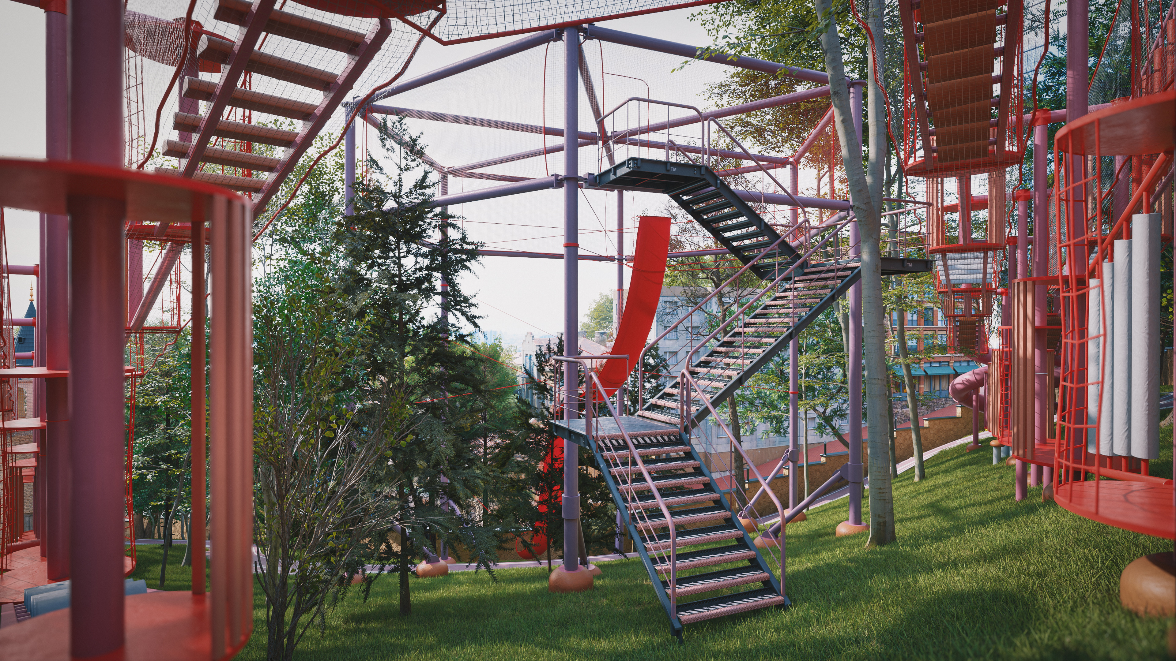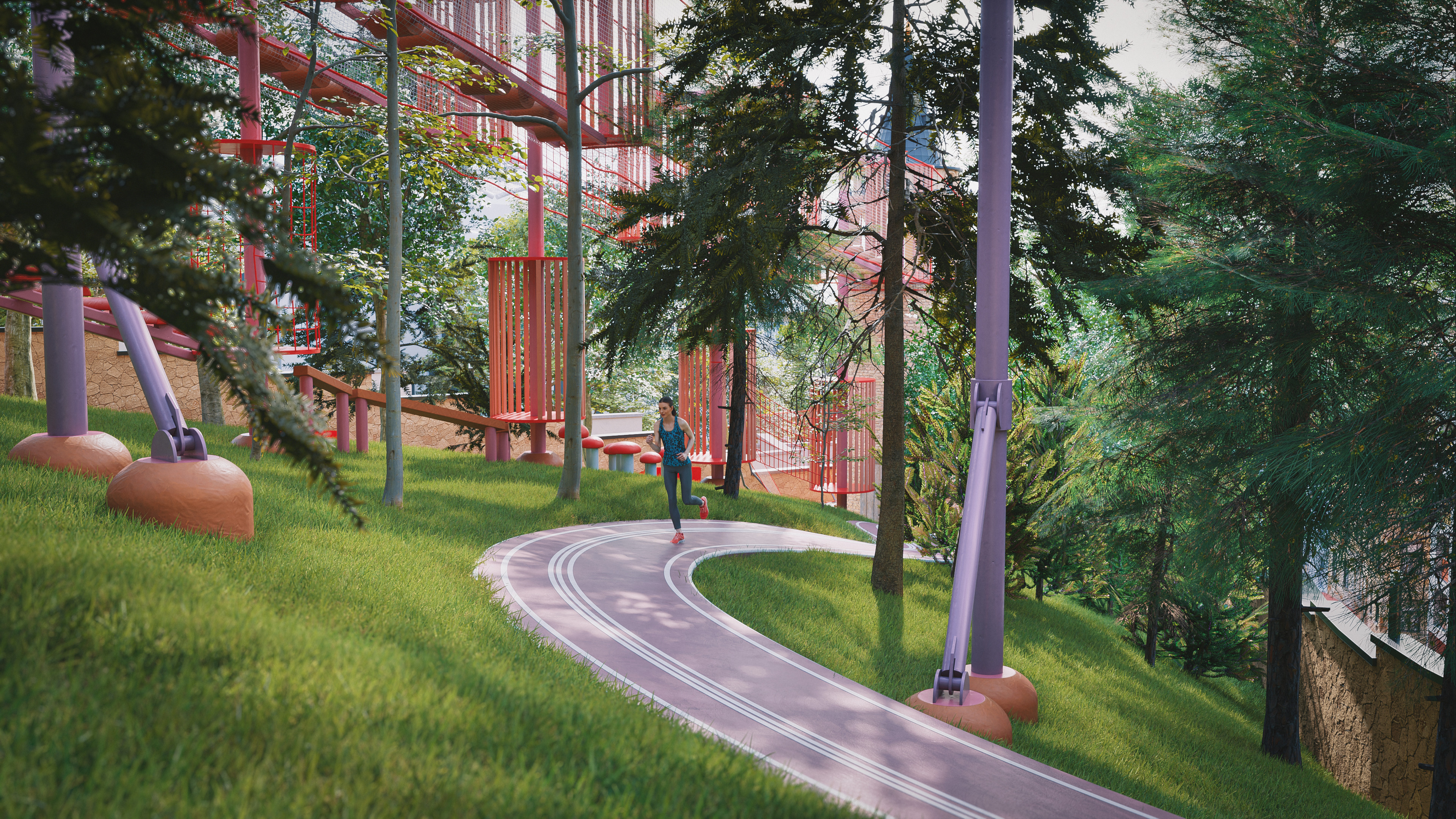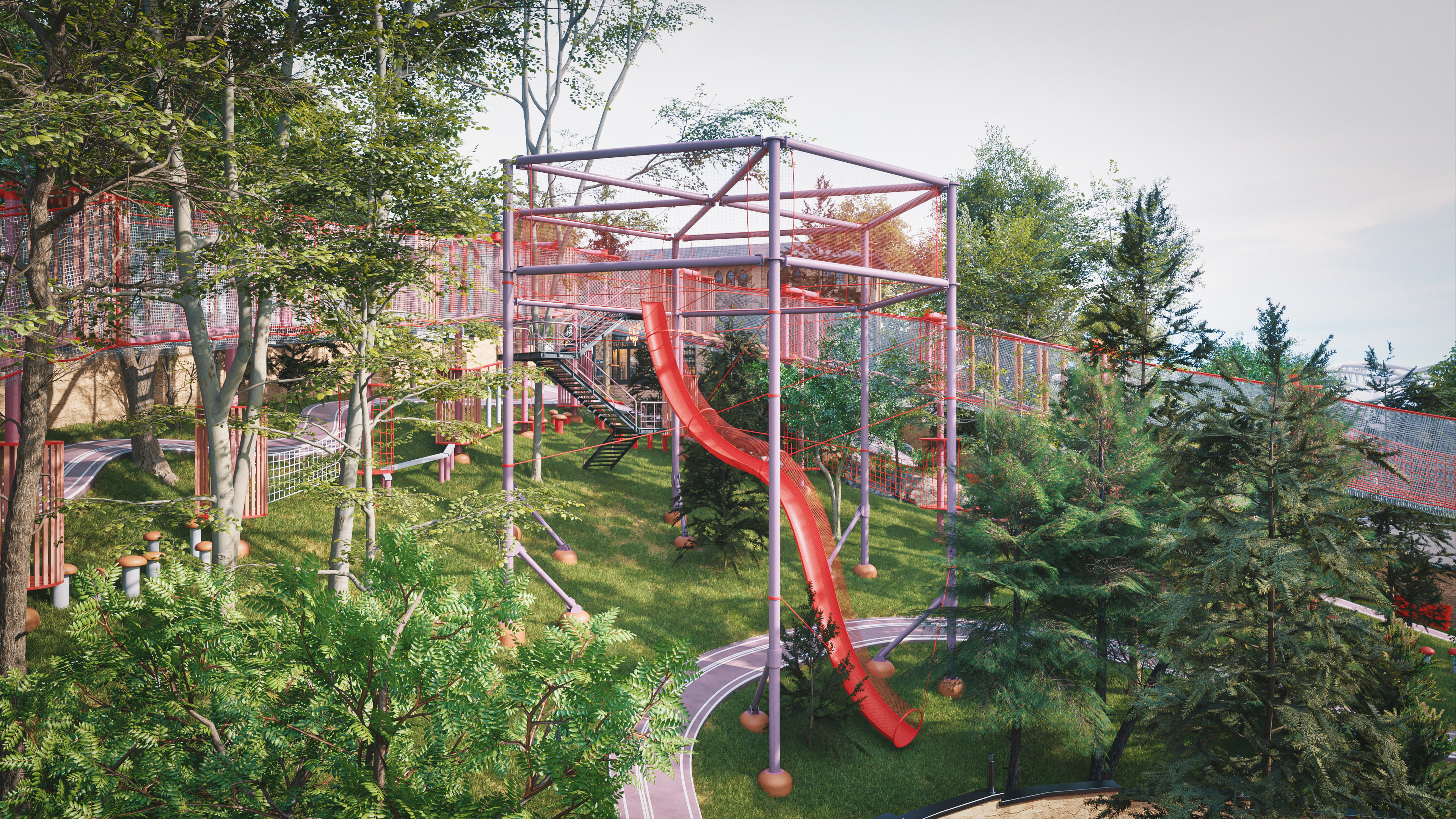 This project represents one of the alternative park concepts developed for the same site in the Beyoğlu district of Istanbul. It was designed as an adventure park that blends recreation and social interaction with nature, without cutting down trees or harming the existing landscape. The project includes a social facility, library, cafe, walking paths, resting areas, and a children’s adventure zone featuring a climbing wall designed as a stylized replica of the Galata Tower.