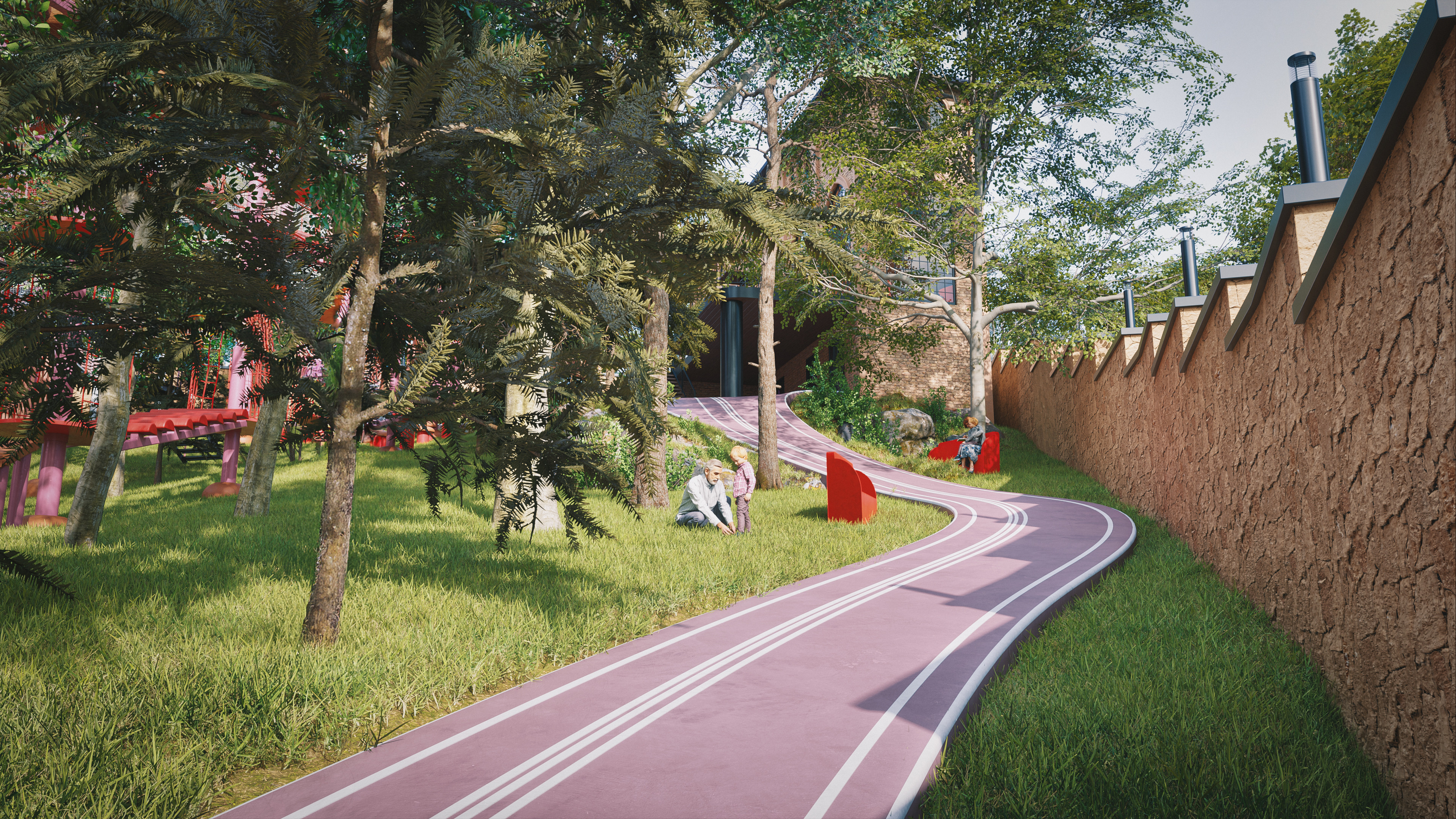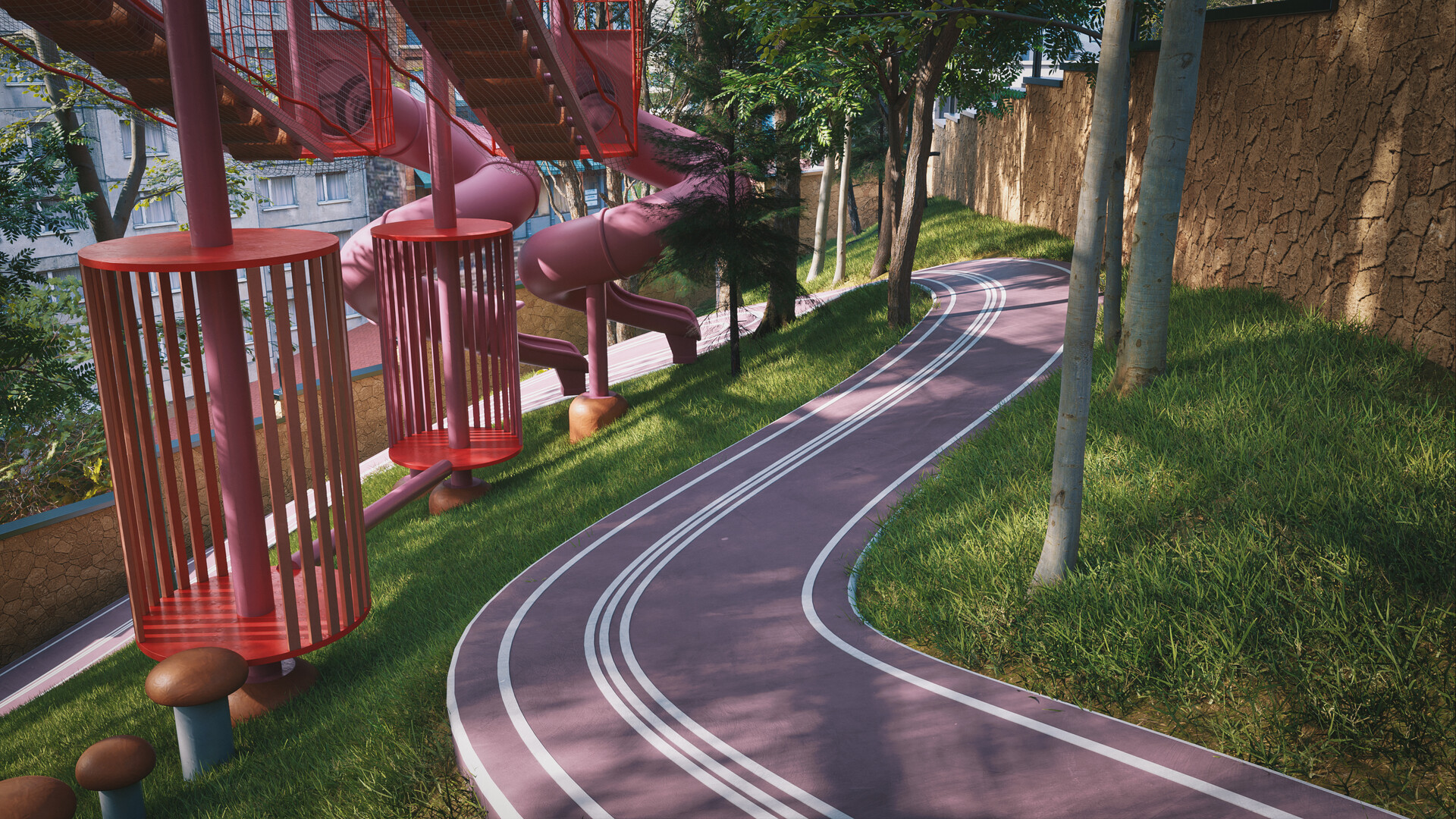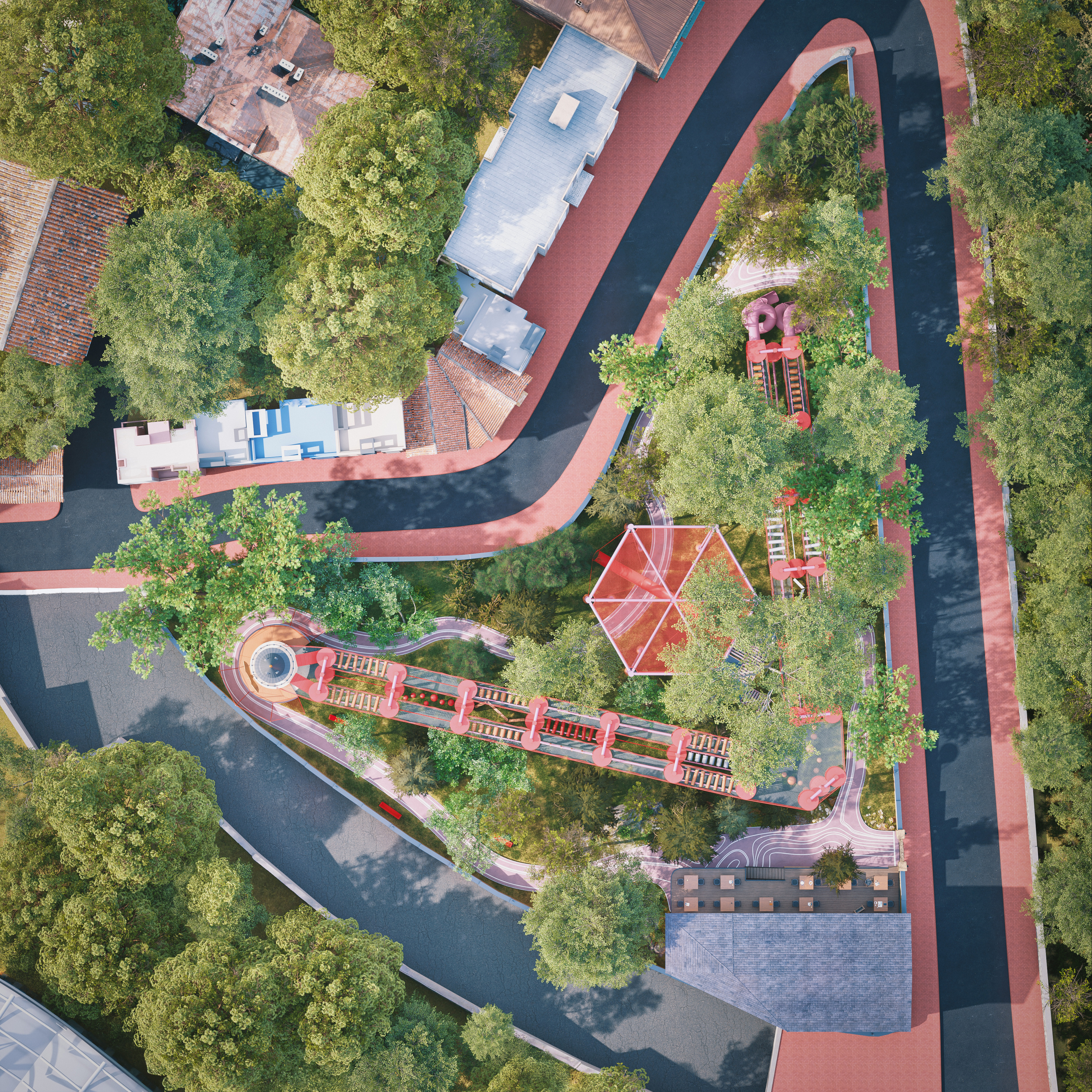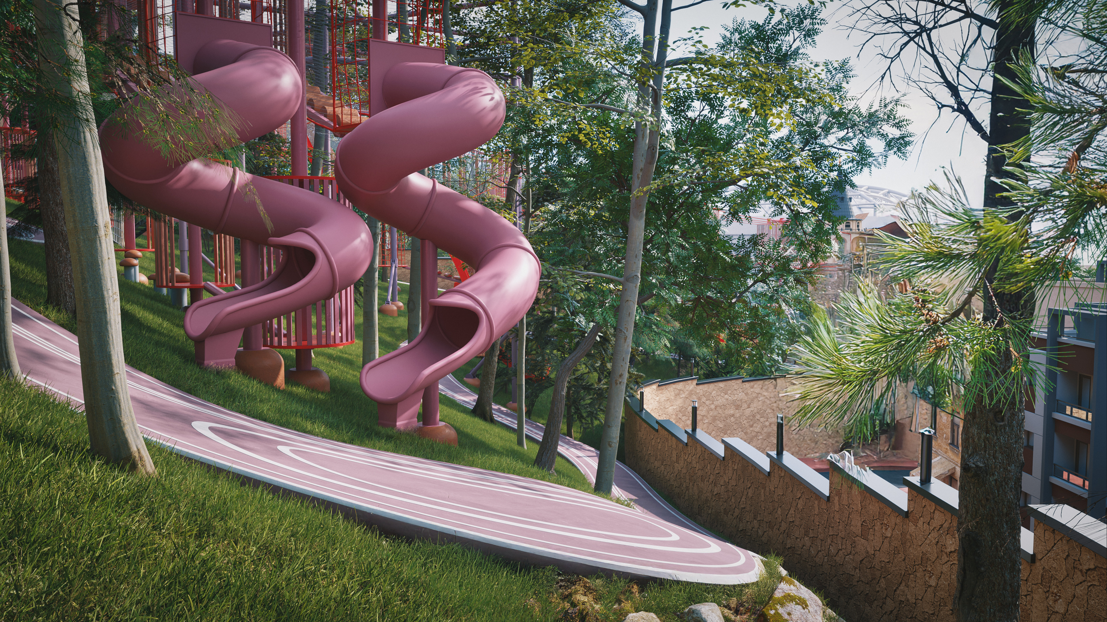 This is one of three different park concepts I created for the same location. Each explored a unique approach to blending architecture and landscape. This particular version was completed within just 17 days from initial concept and design to modeling, lighting, and final rendering.