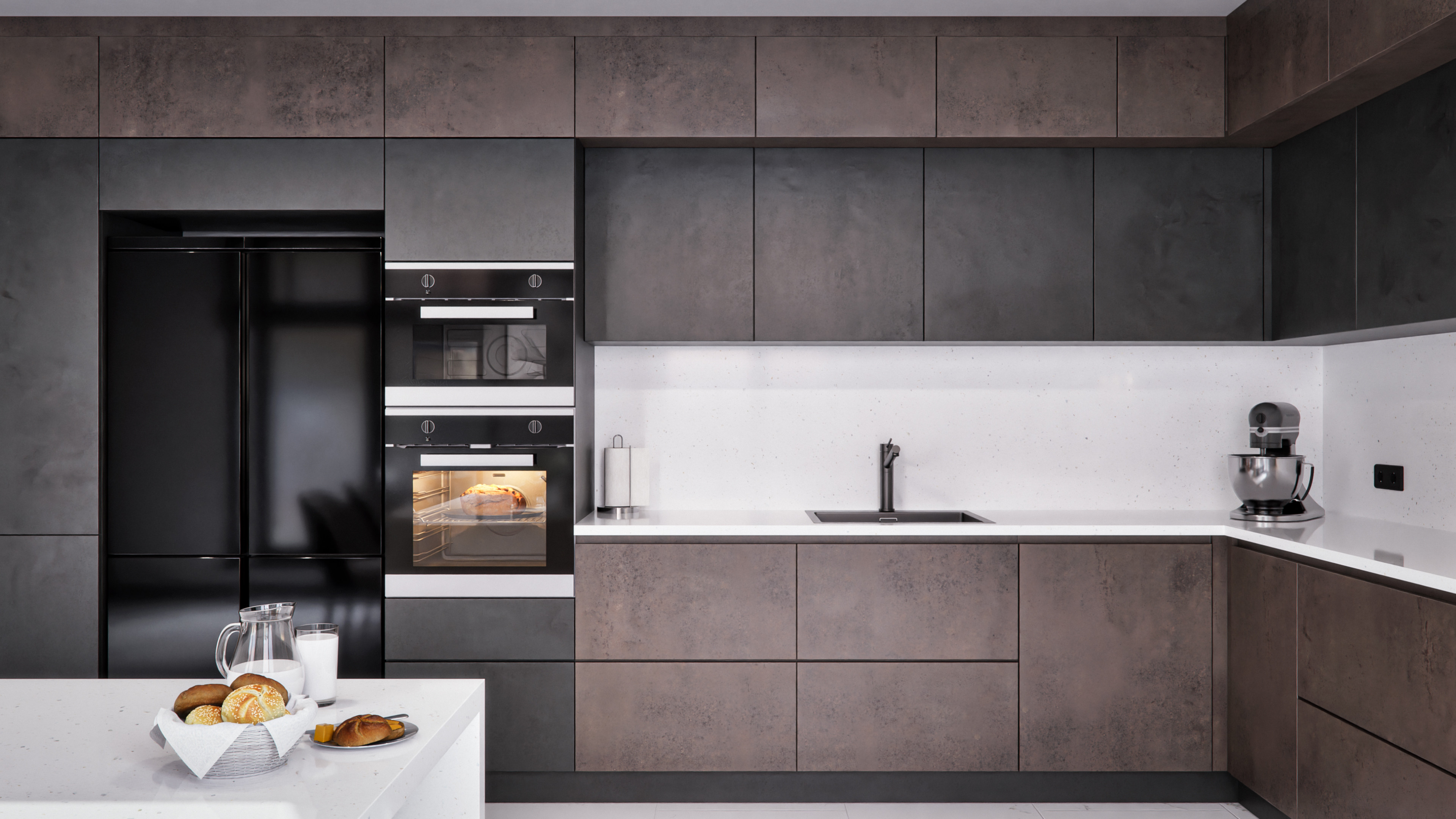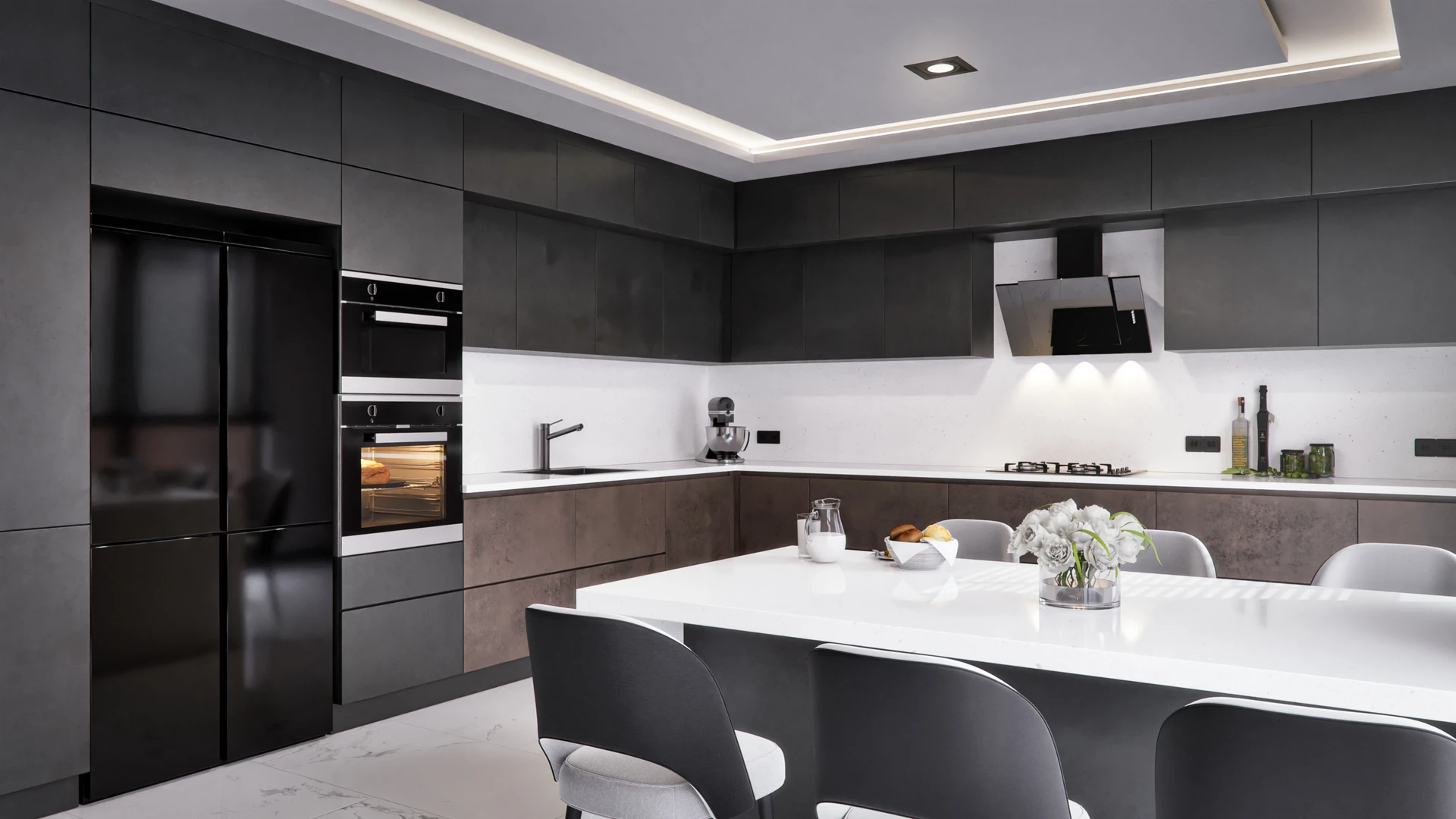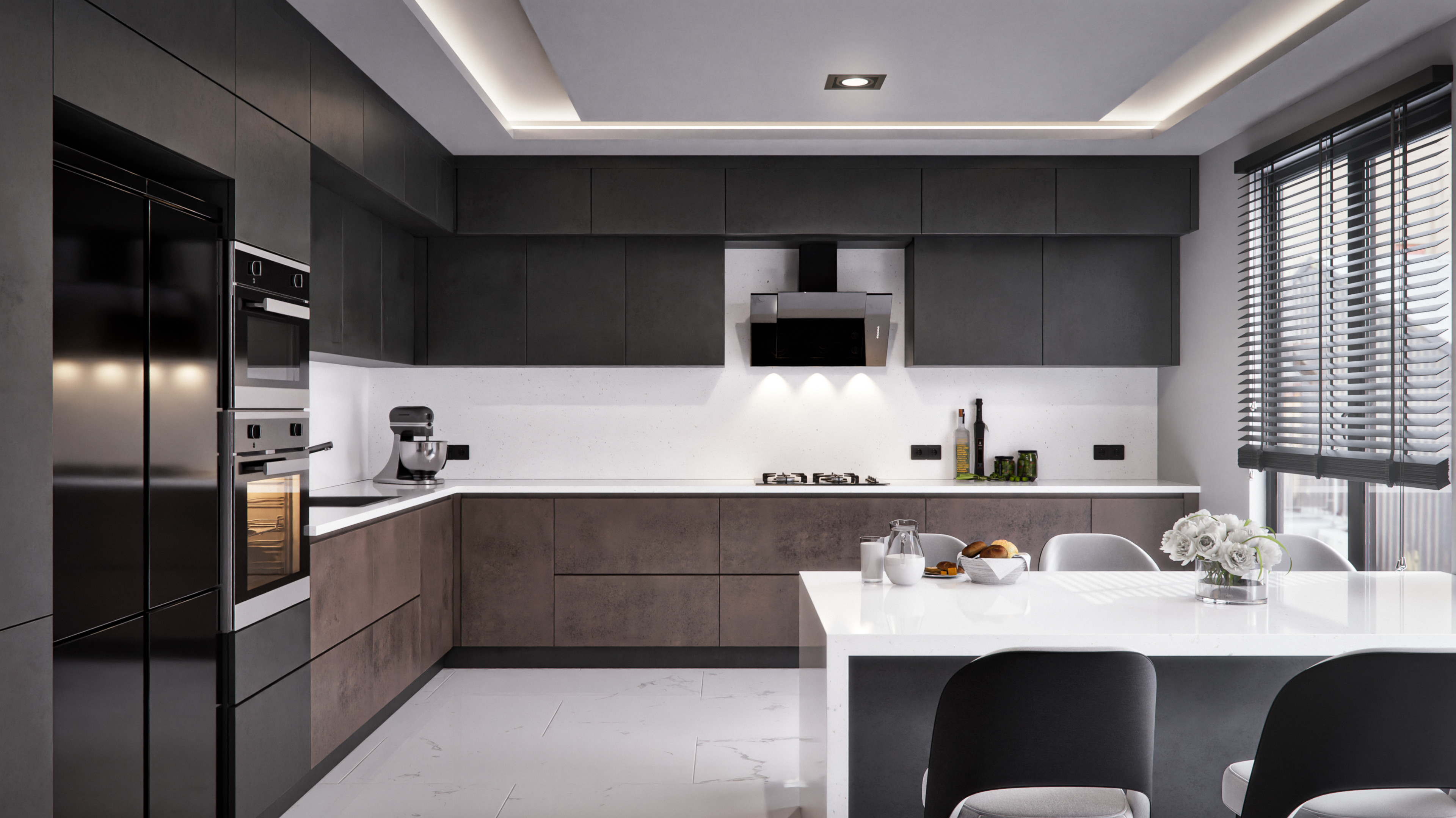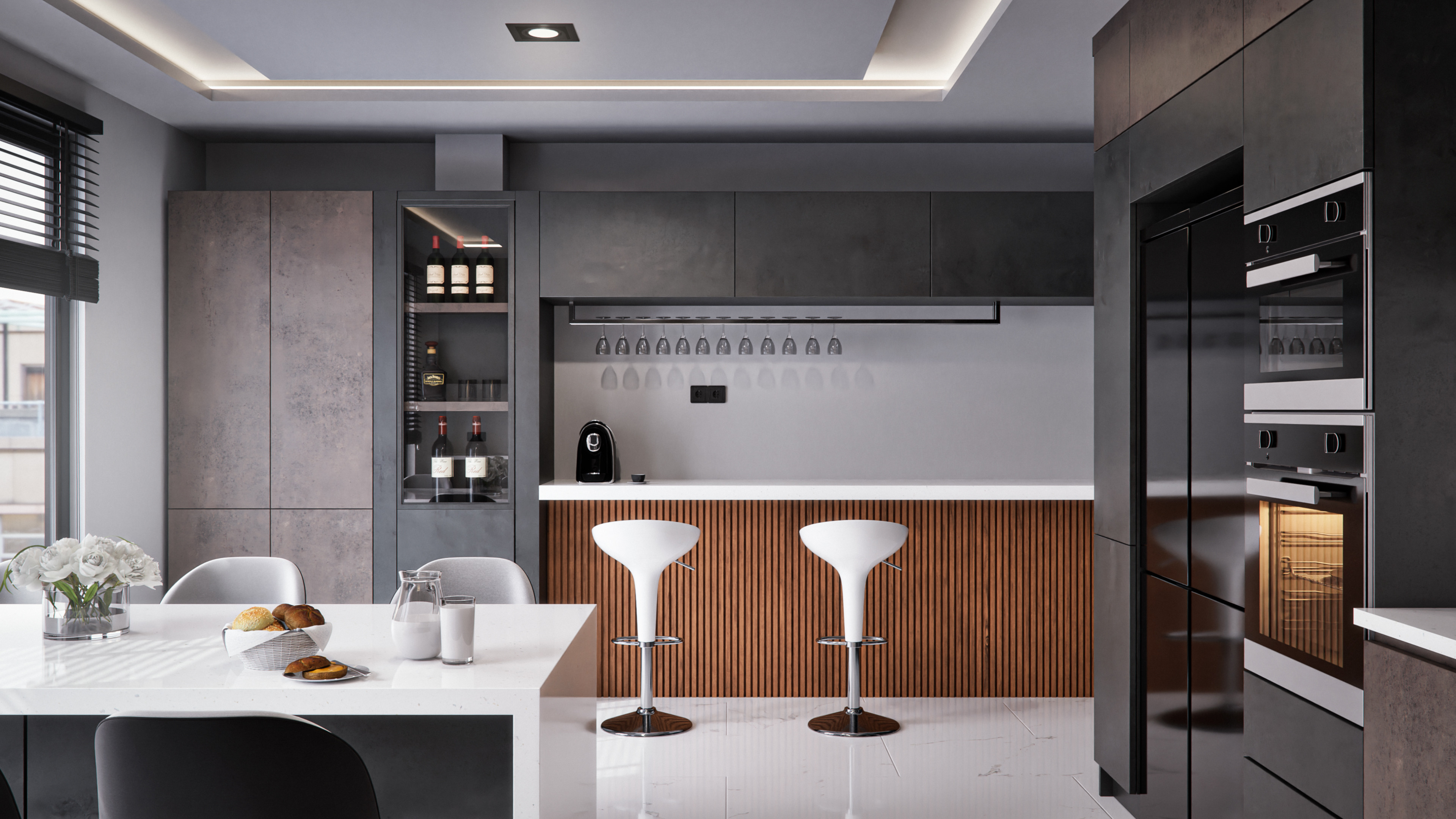 A visualization project I created for the living room, kitchen, and bathrooms of a duplex apartment located on the top two floors of a multi-story building.