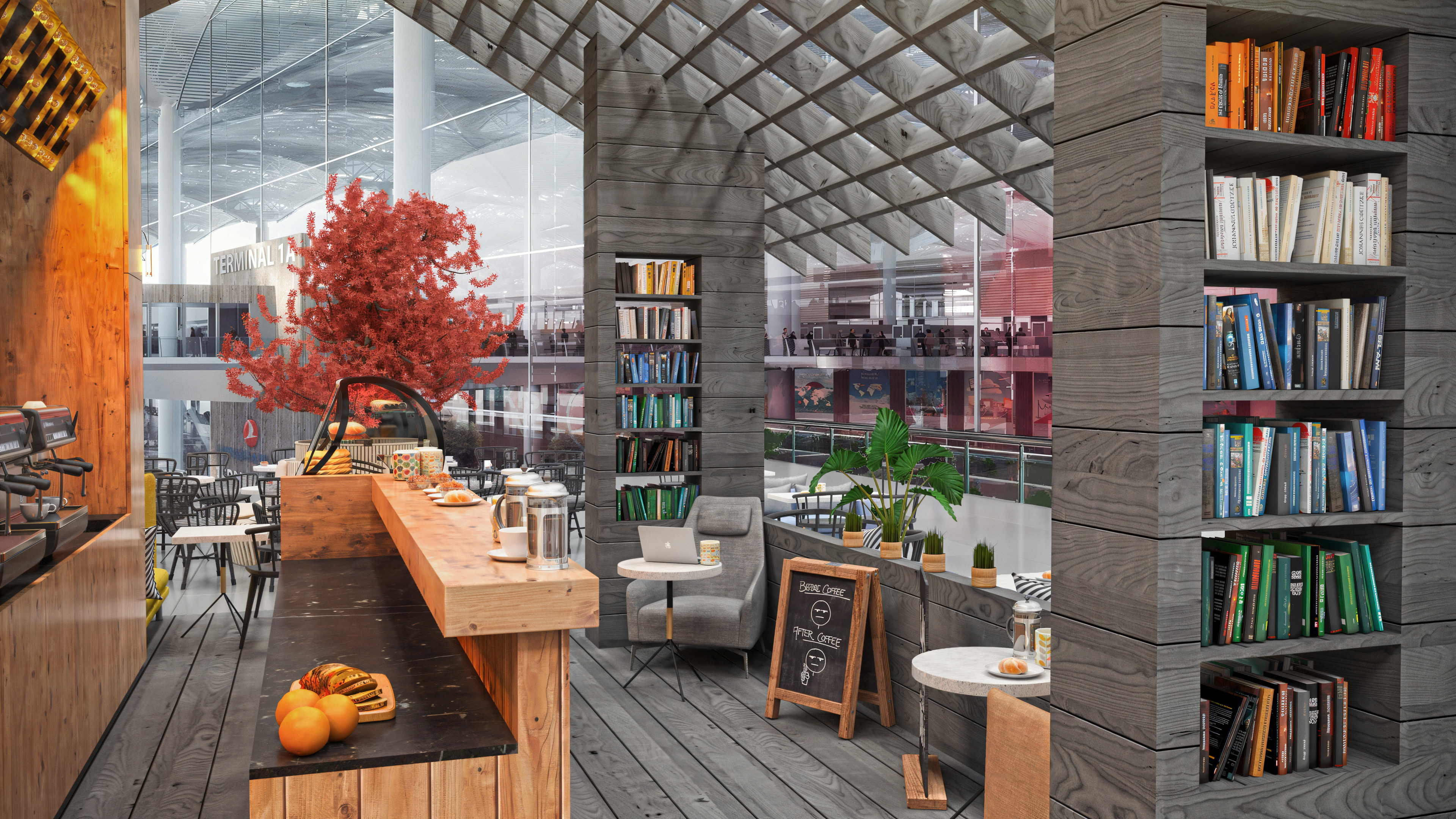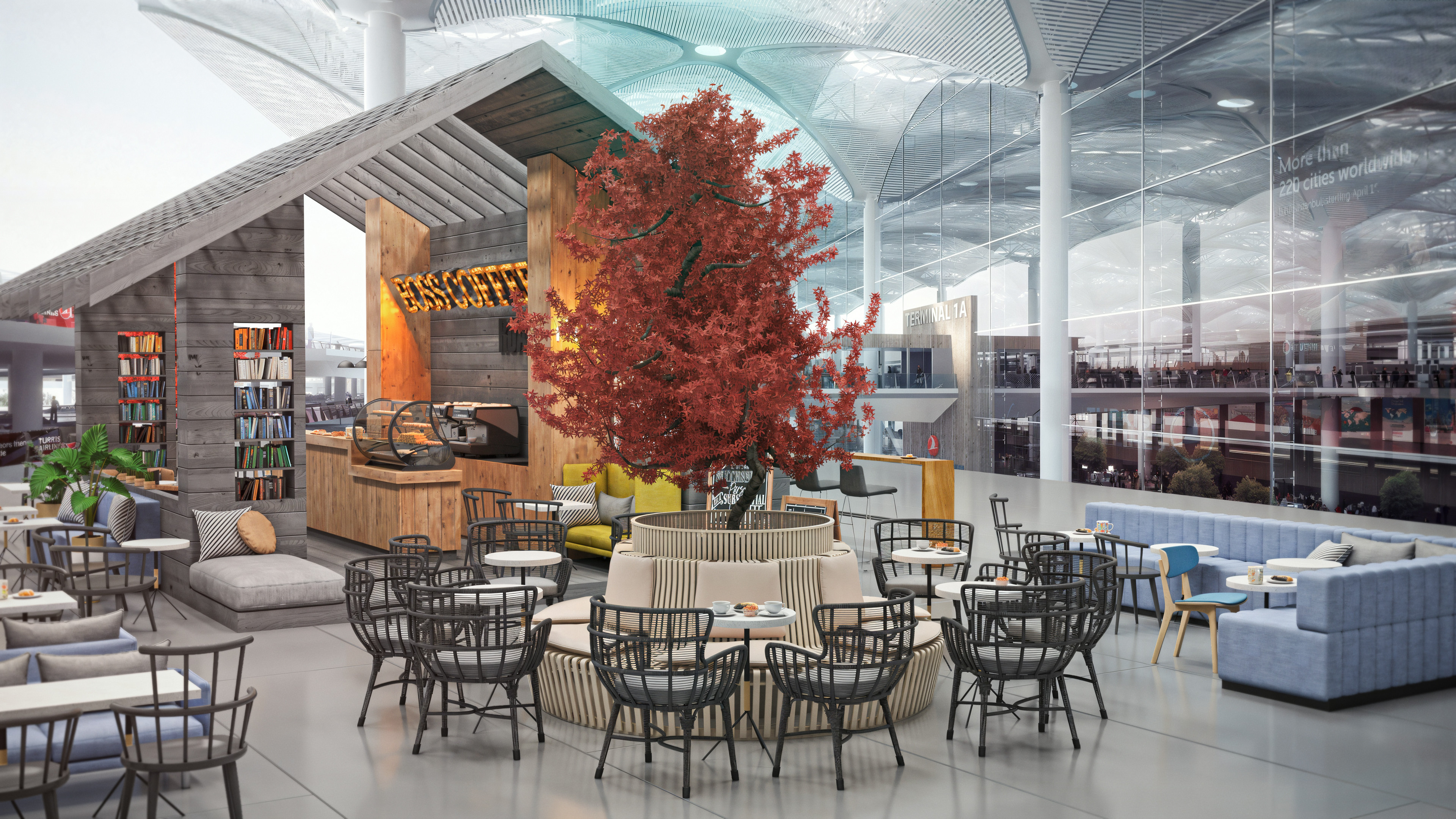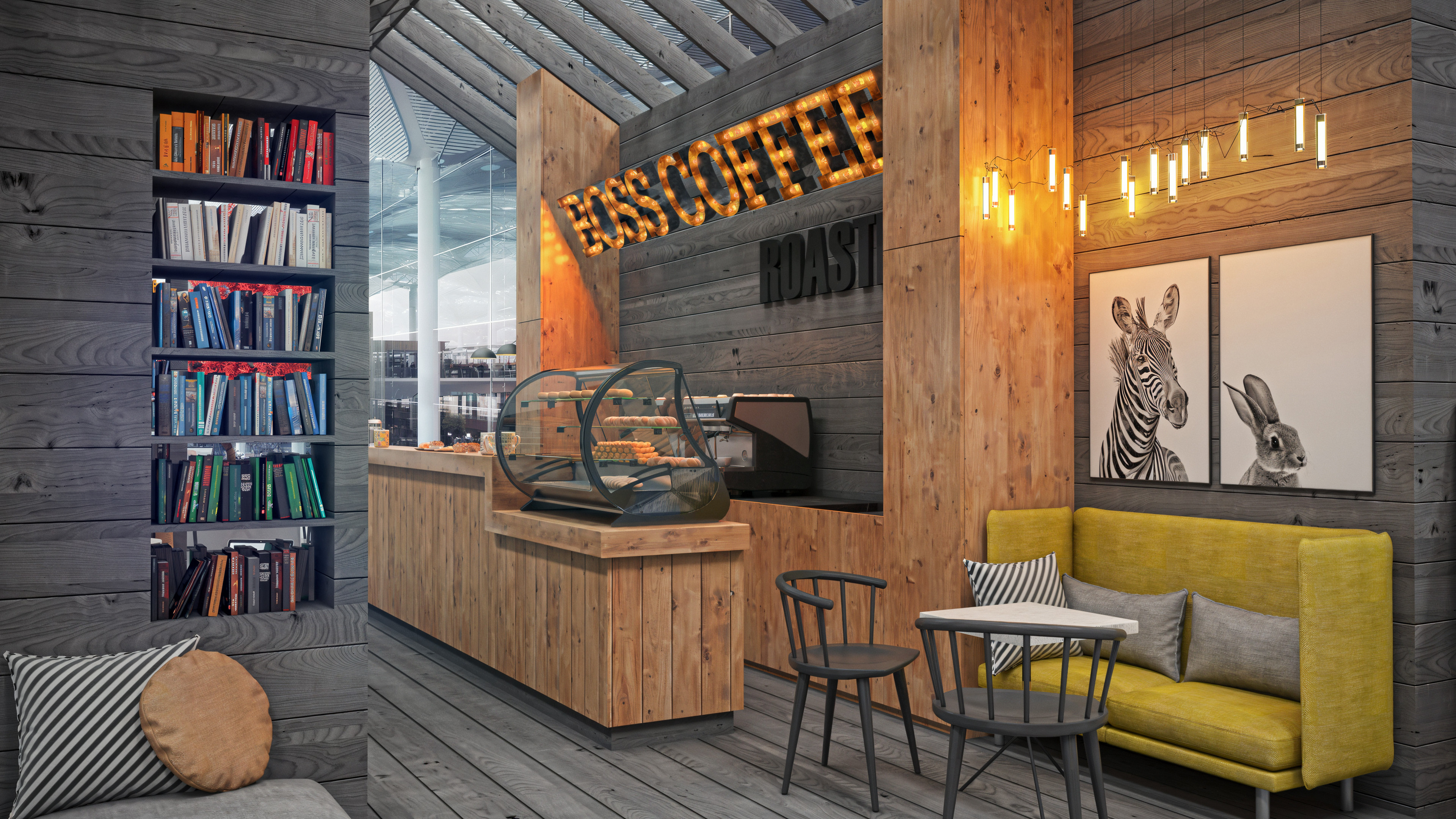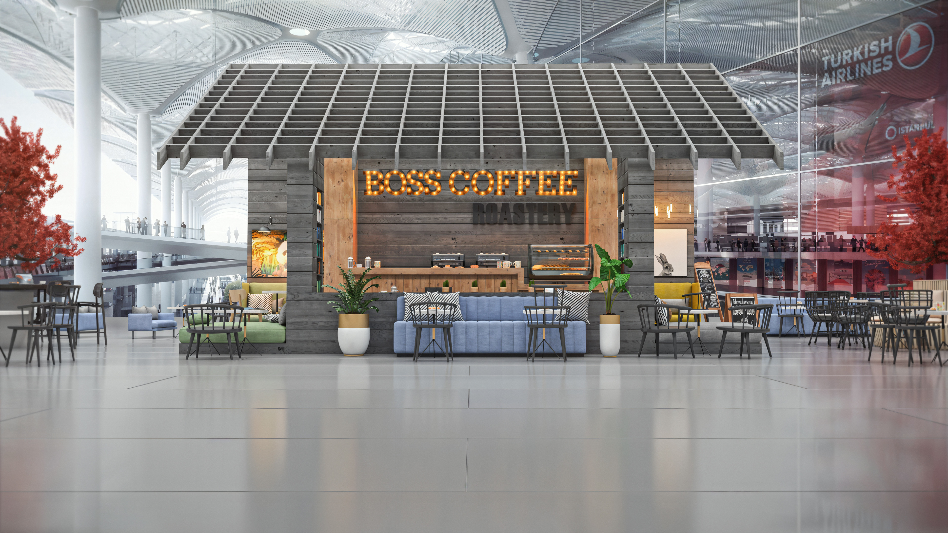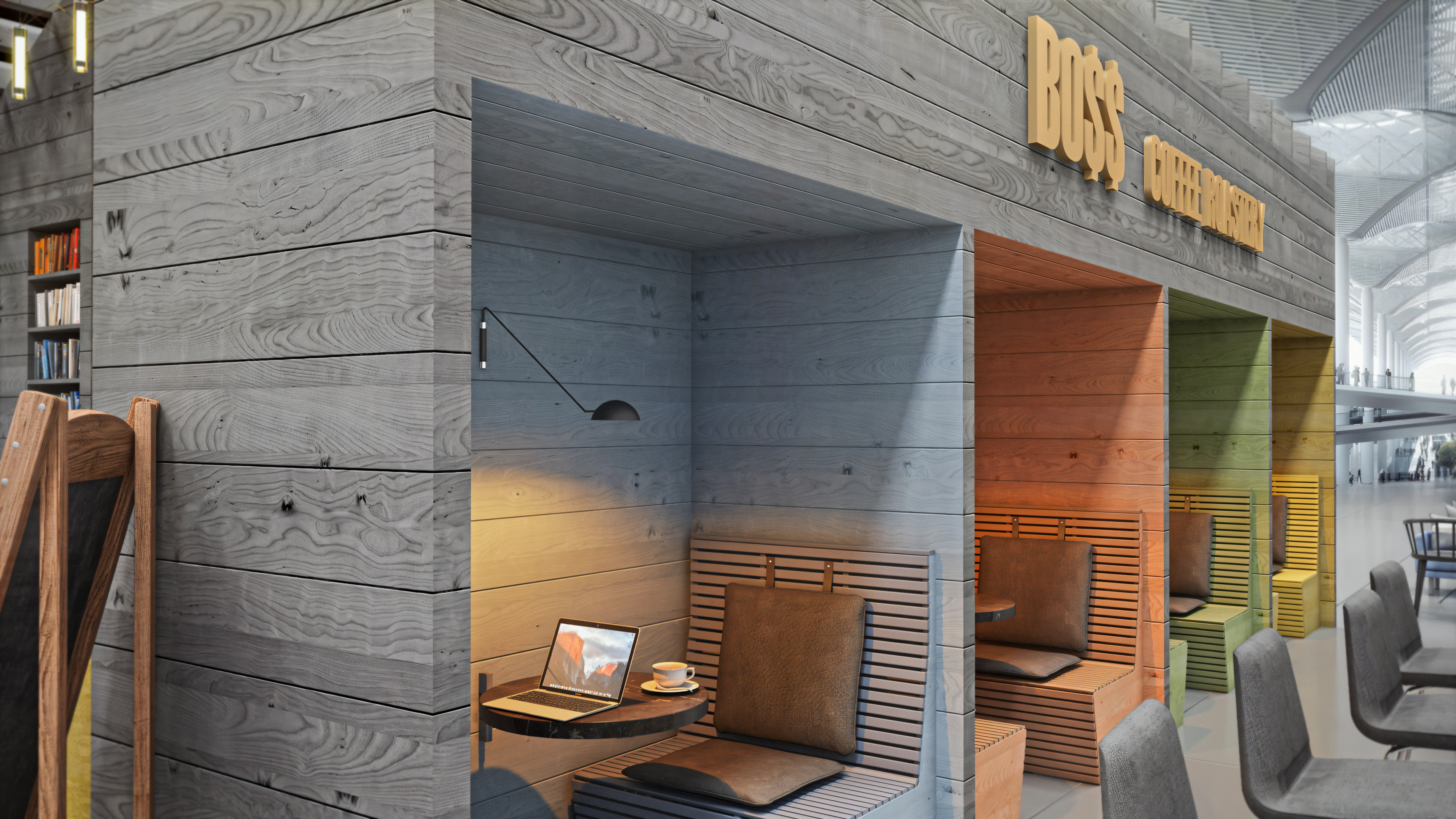 This coffee shop was designed to be located inside the newly built airport in Istanbul. When I worked on this project, the airport itself was still under construction. I completed it toward the end of 2017, and it was one of my first projects rendered with V-Ray.