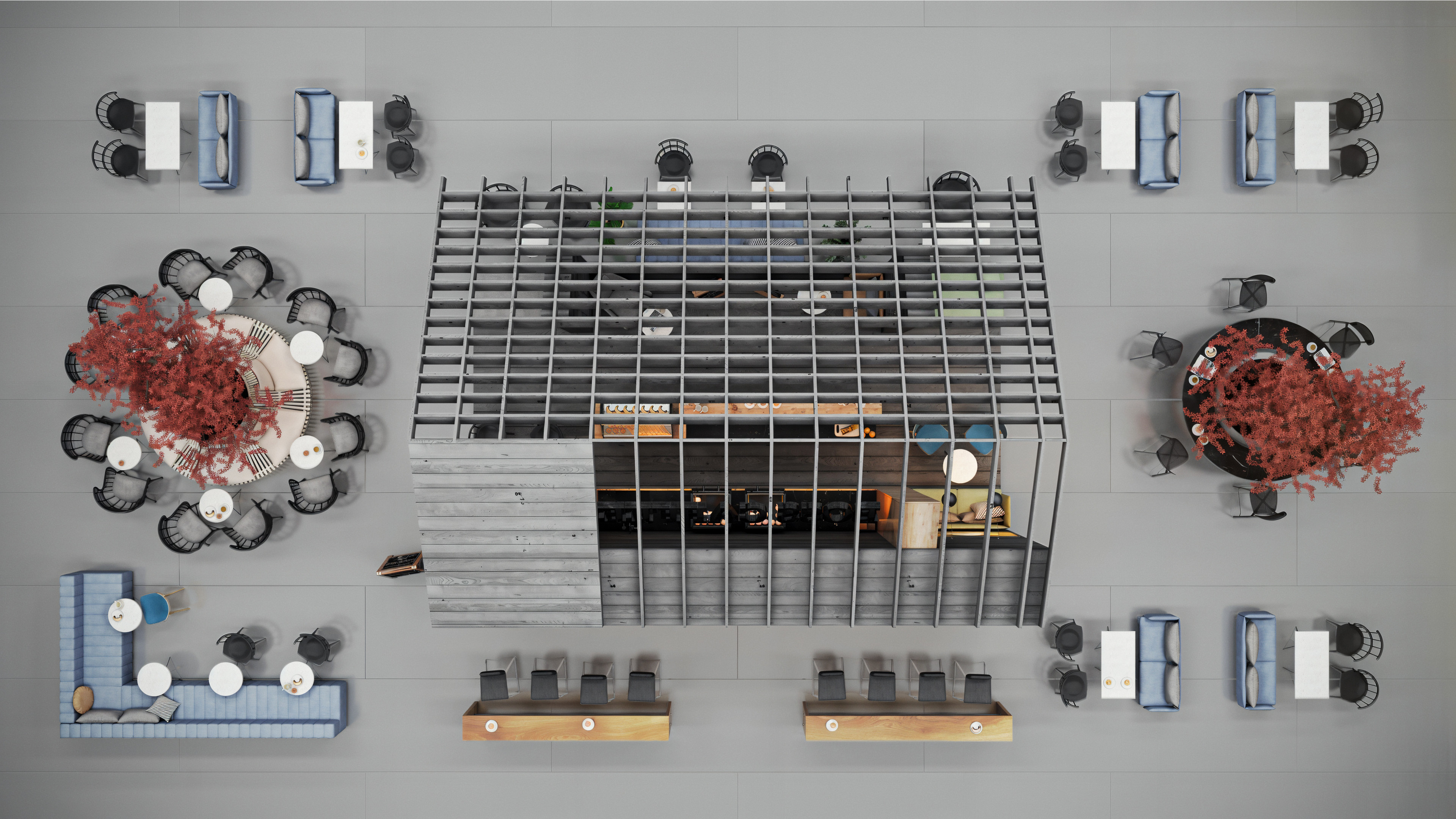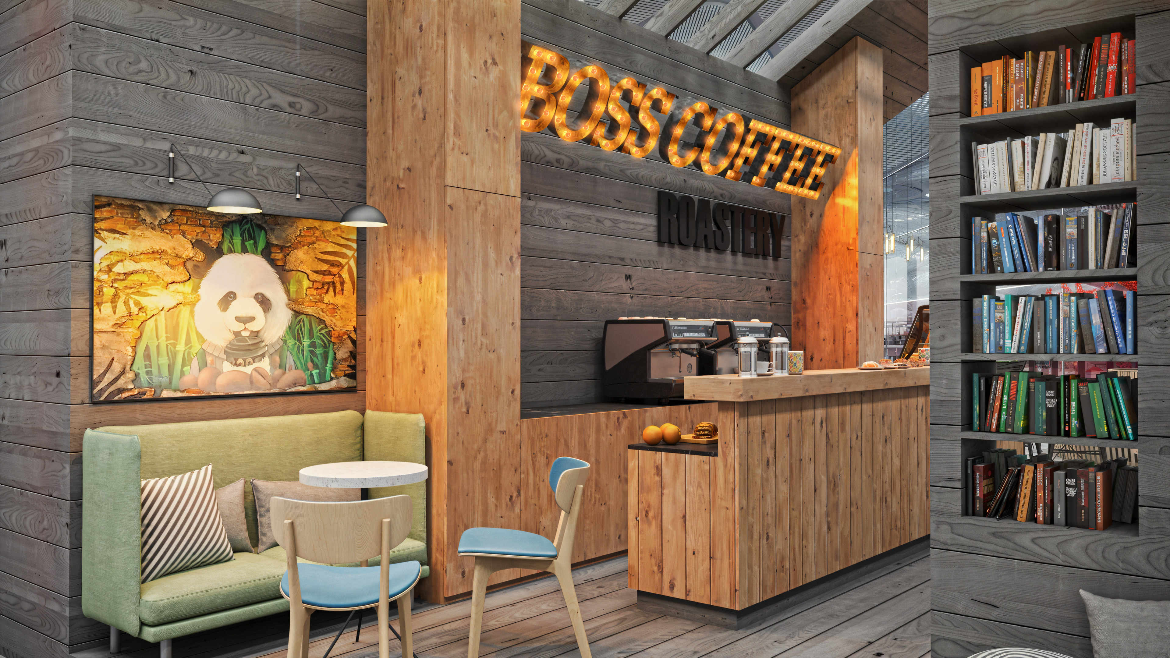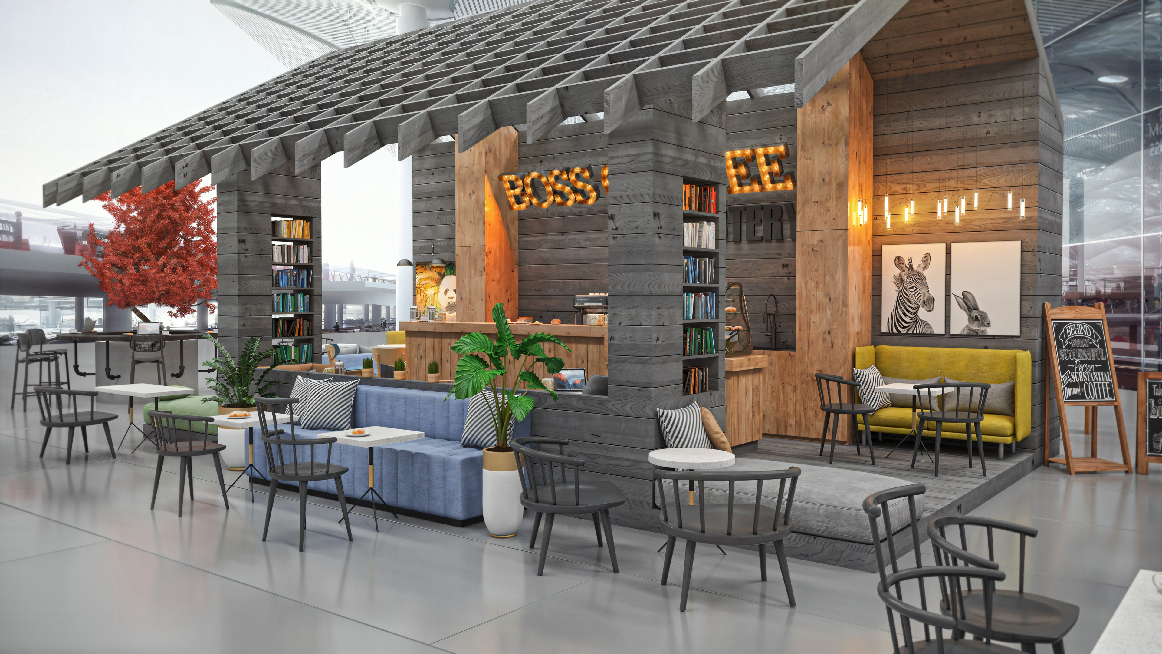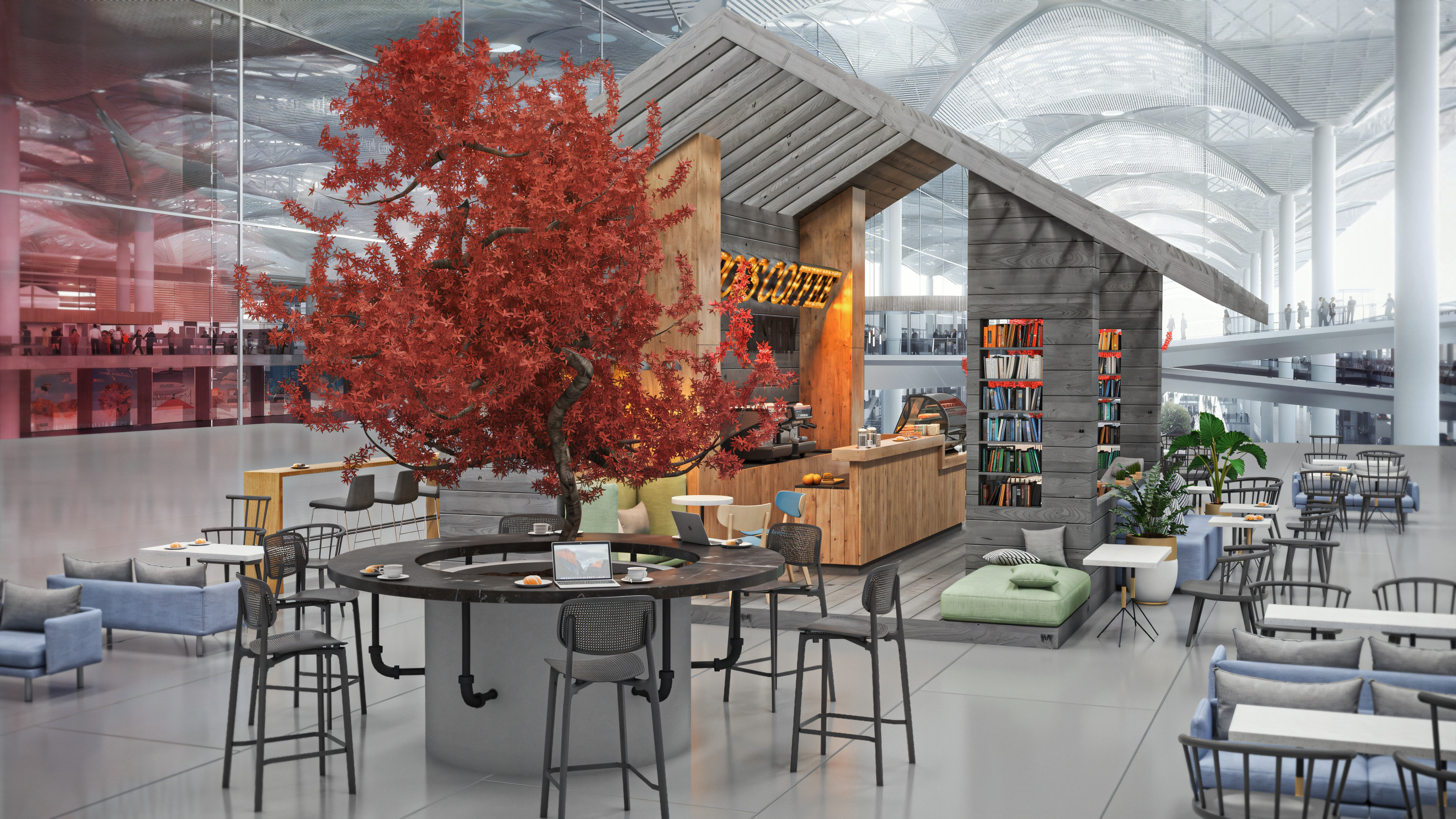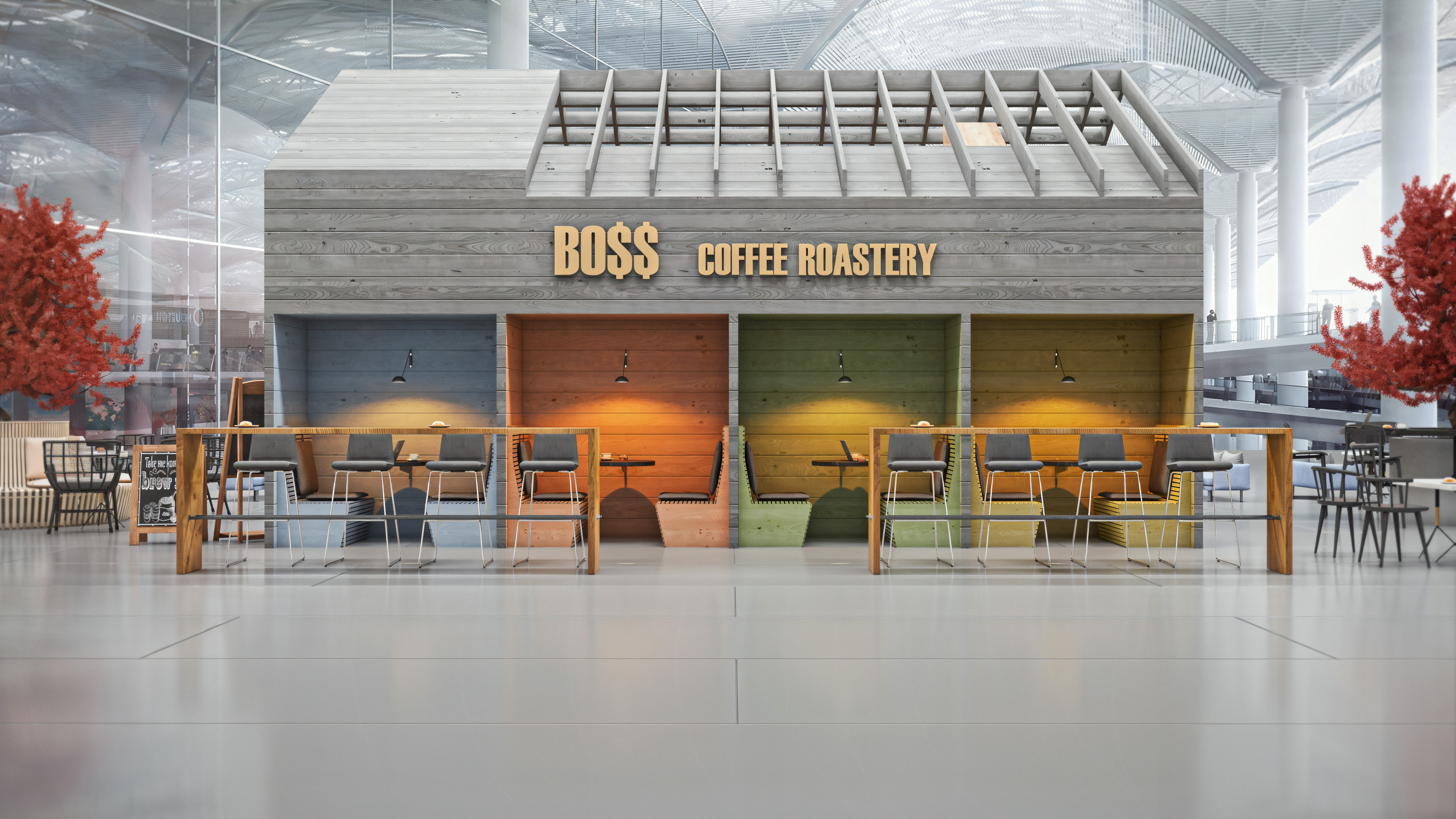 This coffee shop was designed to be located inside the newly built airport in Istanbul. When I worked on this project, the airport itself was still under construction. I completed it toward the end of 2017, and it was one of my first projects rendered with V-Ray.