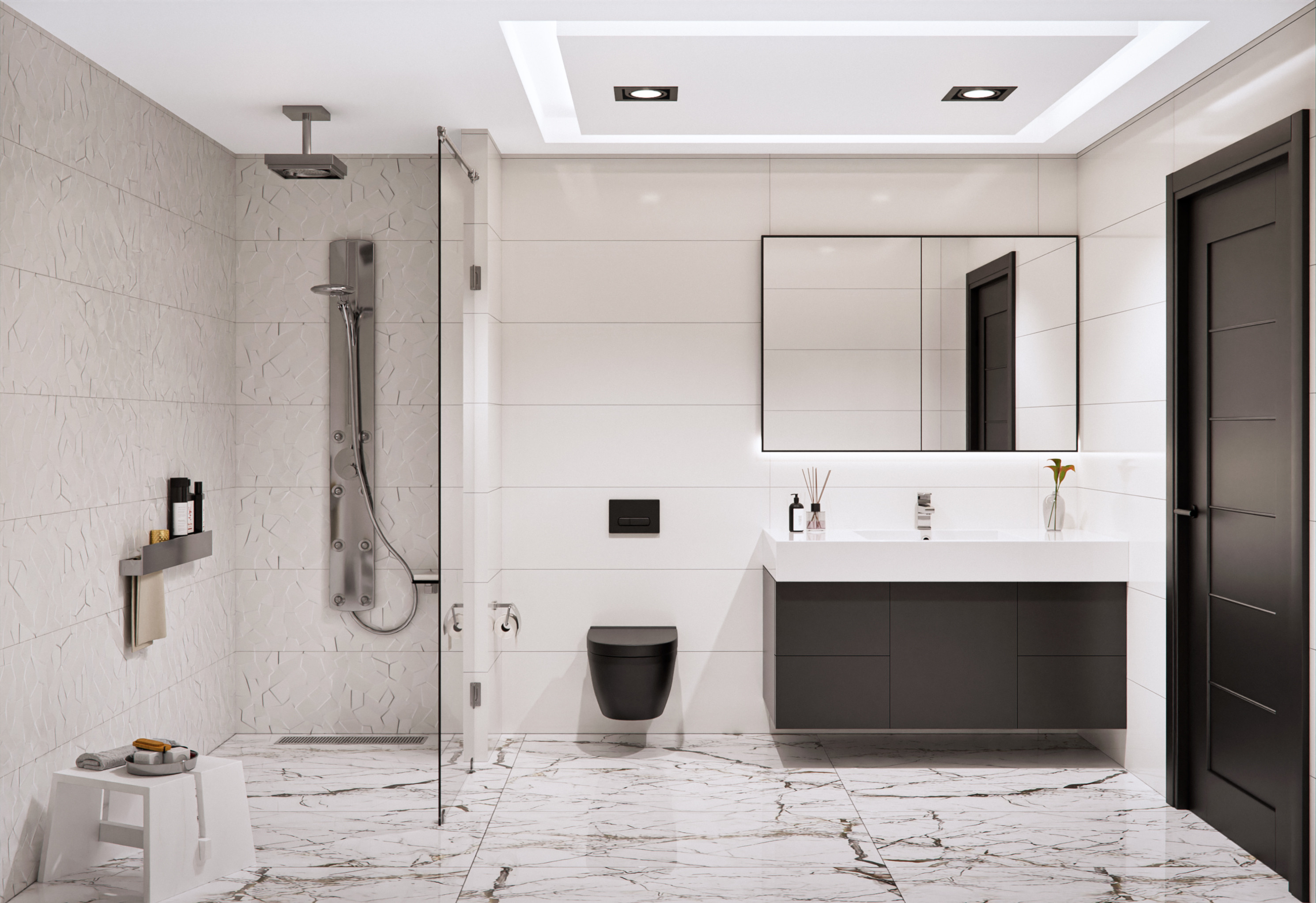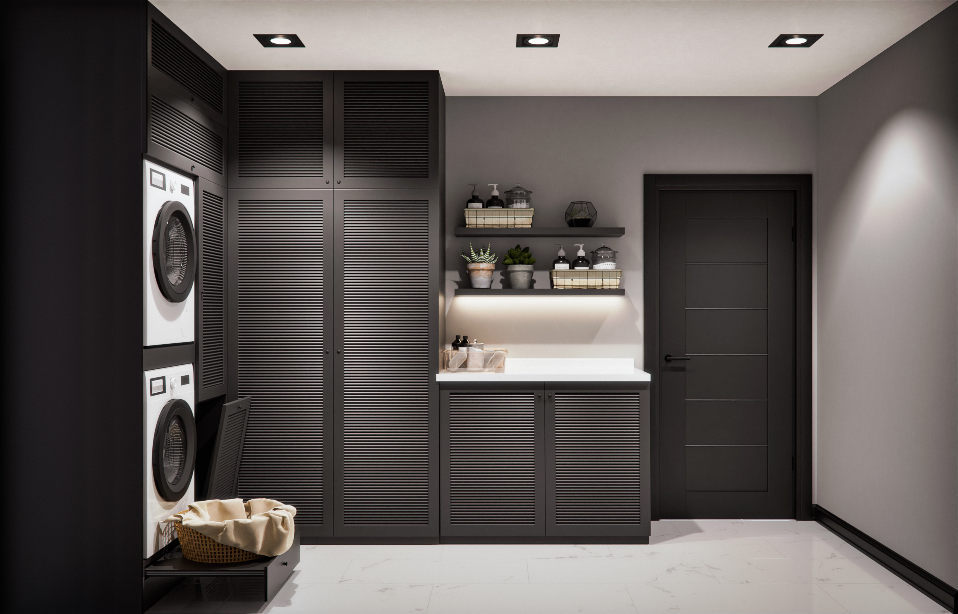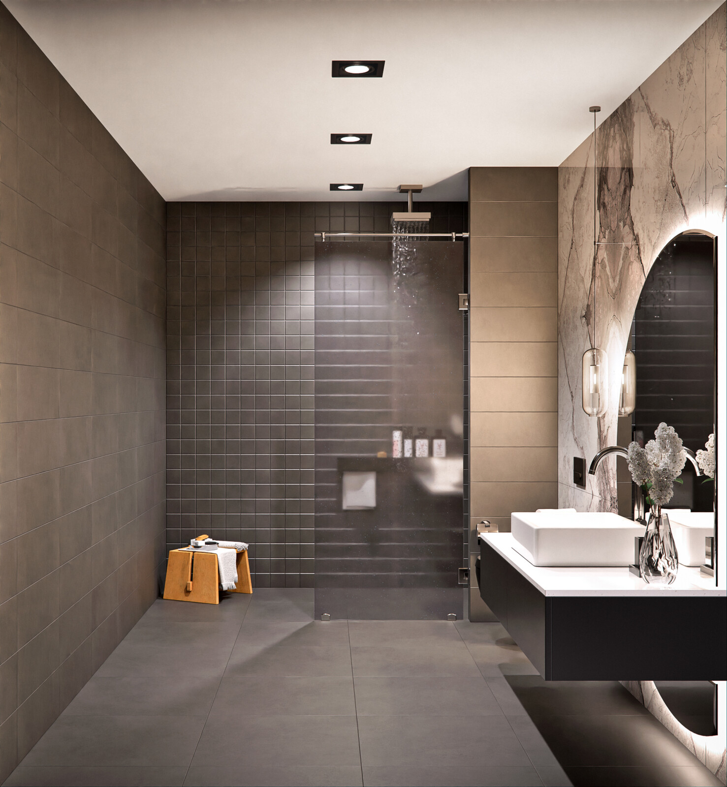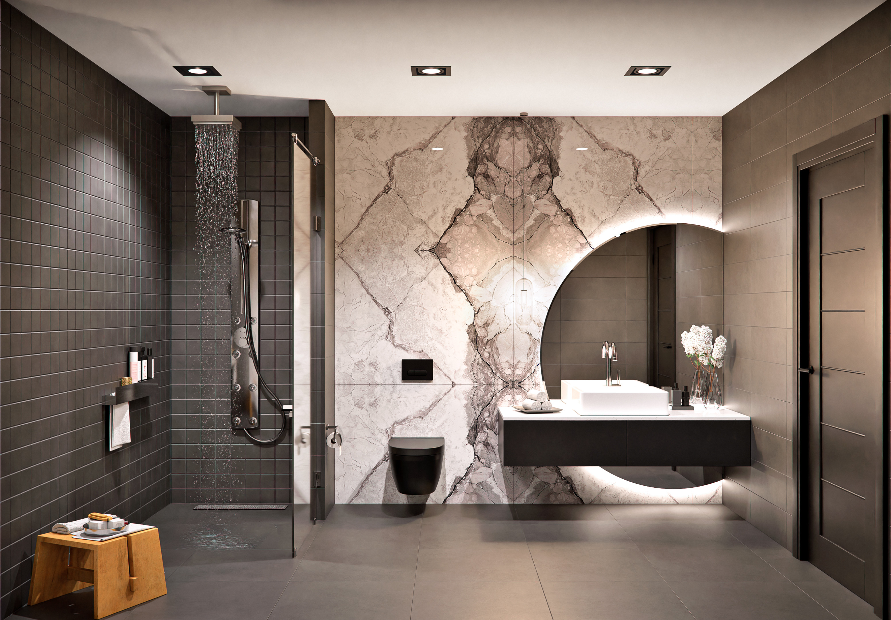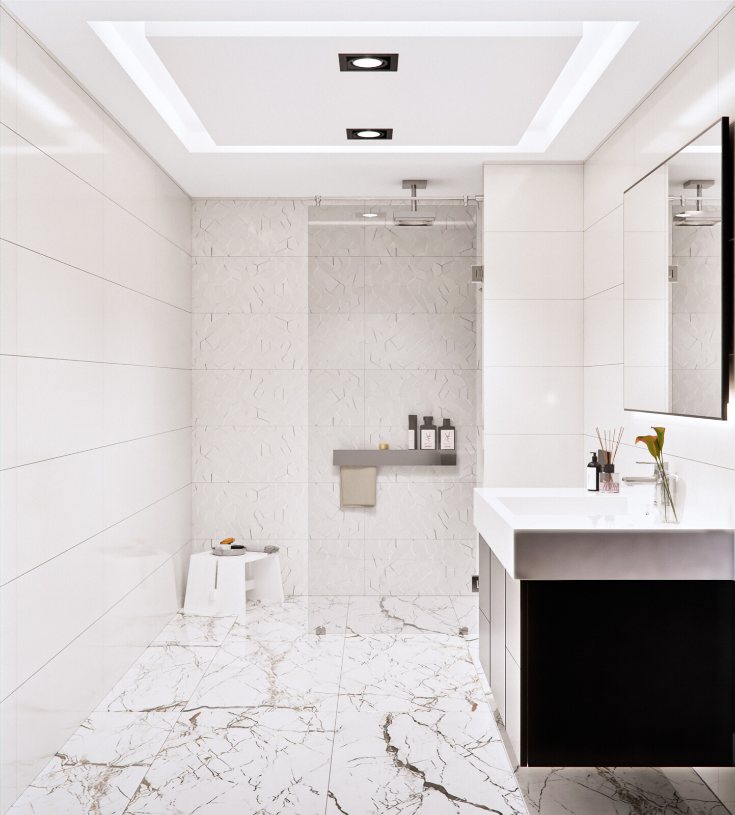 A visualization project I created for the living room, kitchen, and bathrooms of a duplex apartment located on the top two floors of a multi-story building.