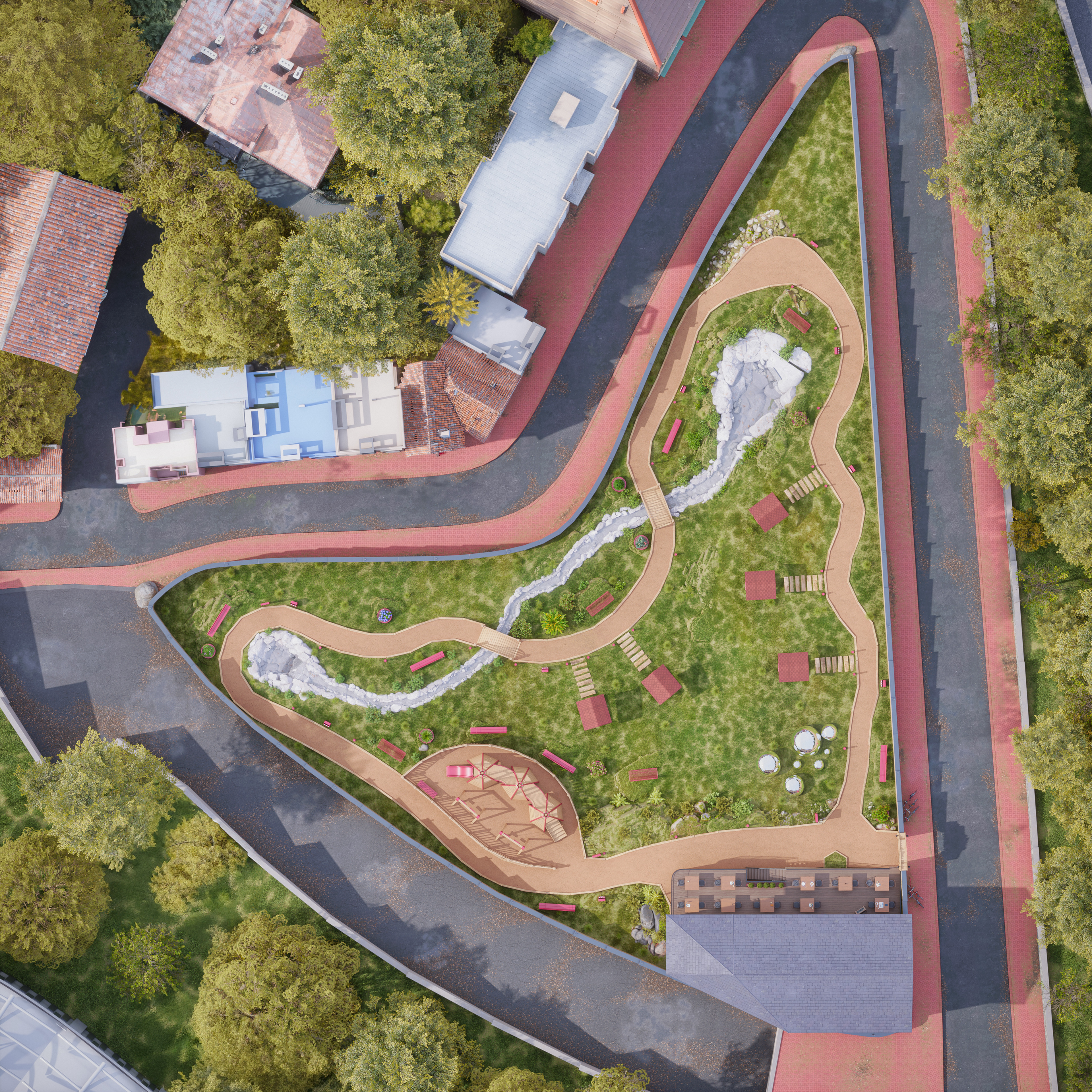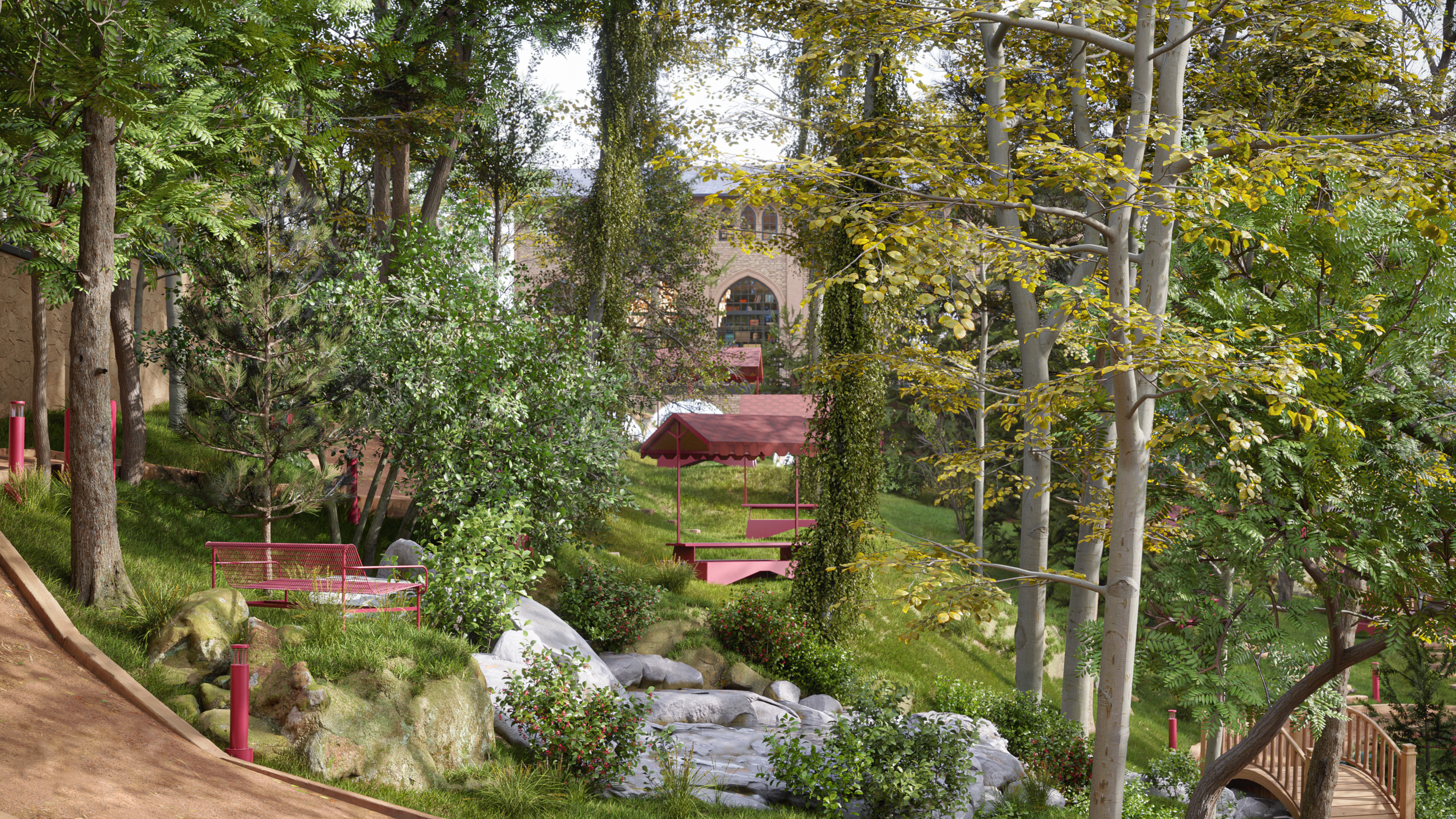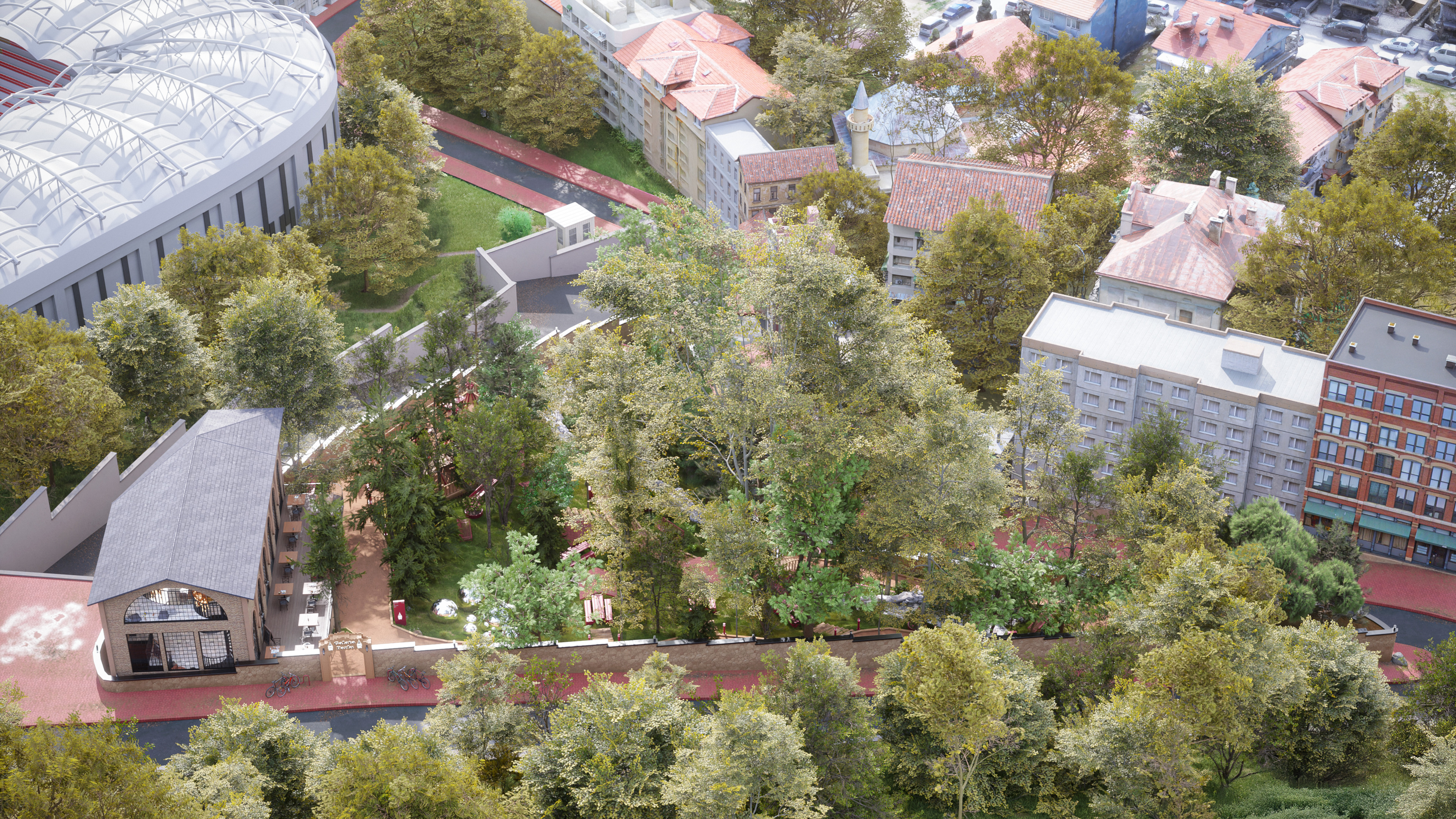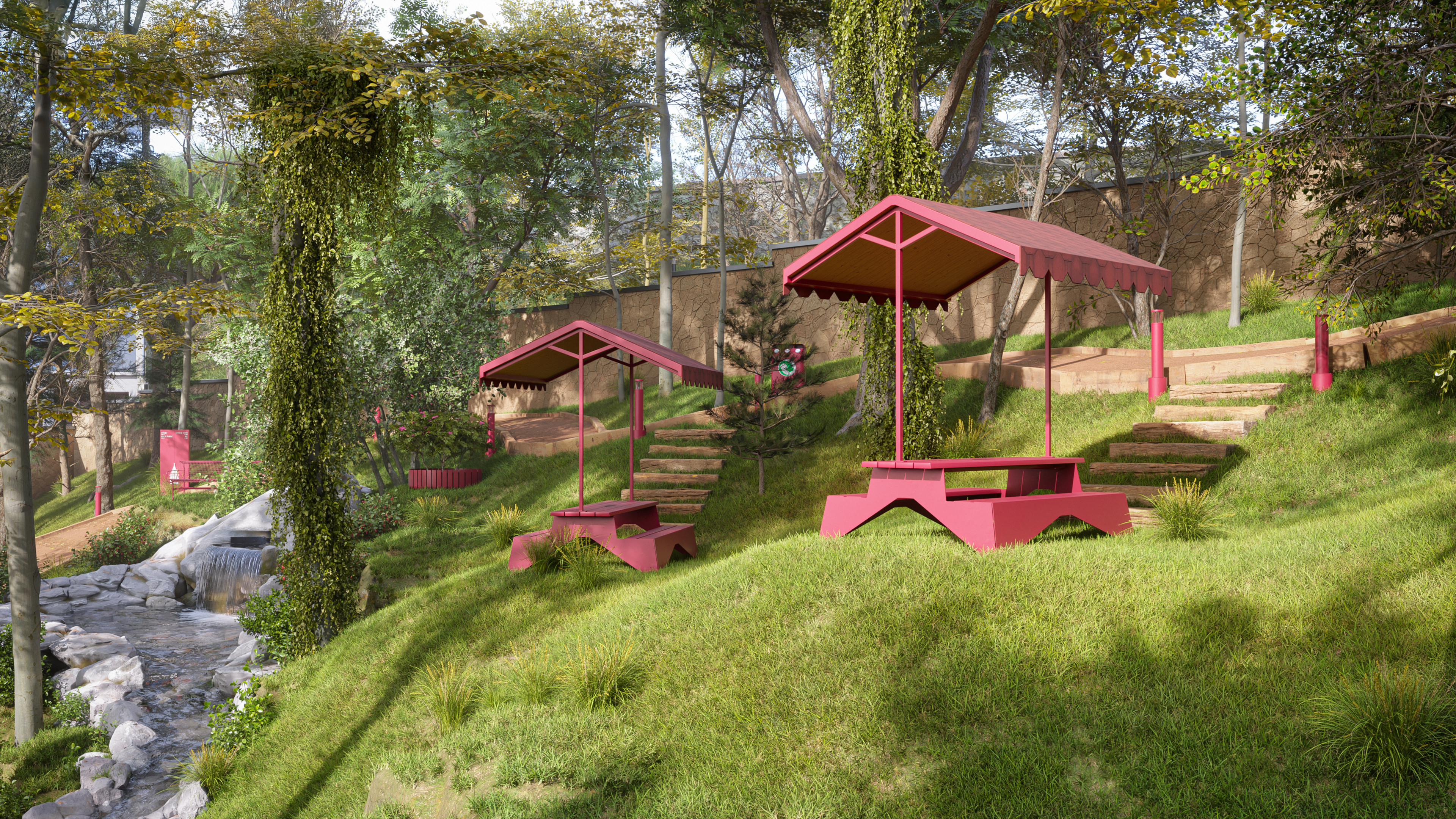 This project was designed to be built within a wooded park in the Beyoğlu district of Istanbul, without harming the natural environment or cutting down any trees. It consists of spaces where people of all ages can enjoy their time including a social facility, library, cafe, a small waterfall, an artificial pond and stream, walking paths, gazebos, picnic areas, a playground, and benches scattered throughout the park.