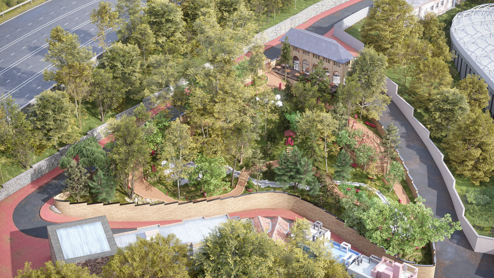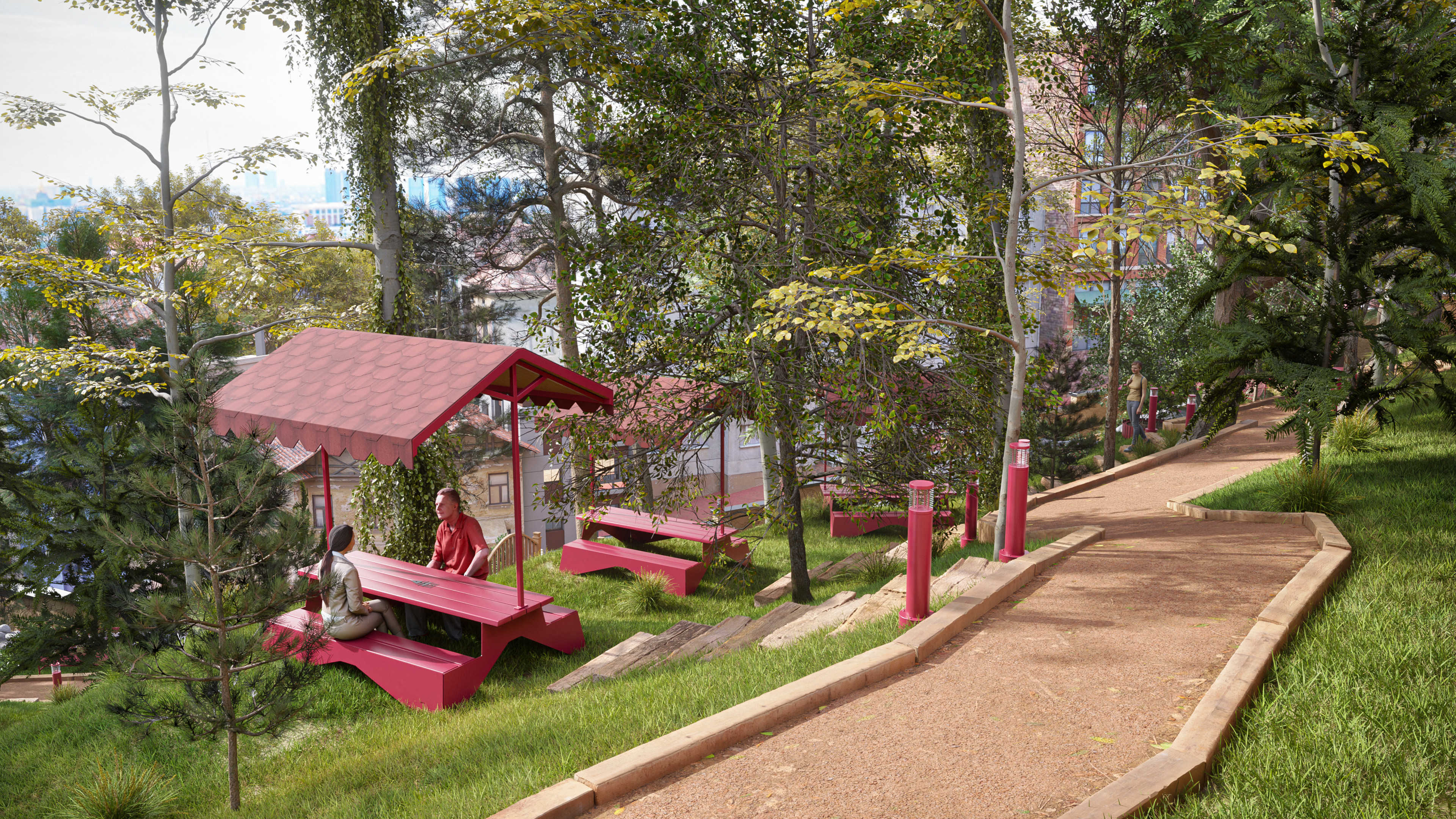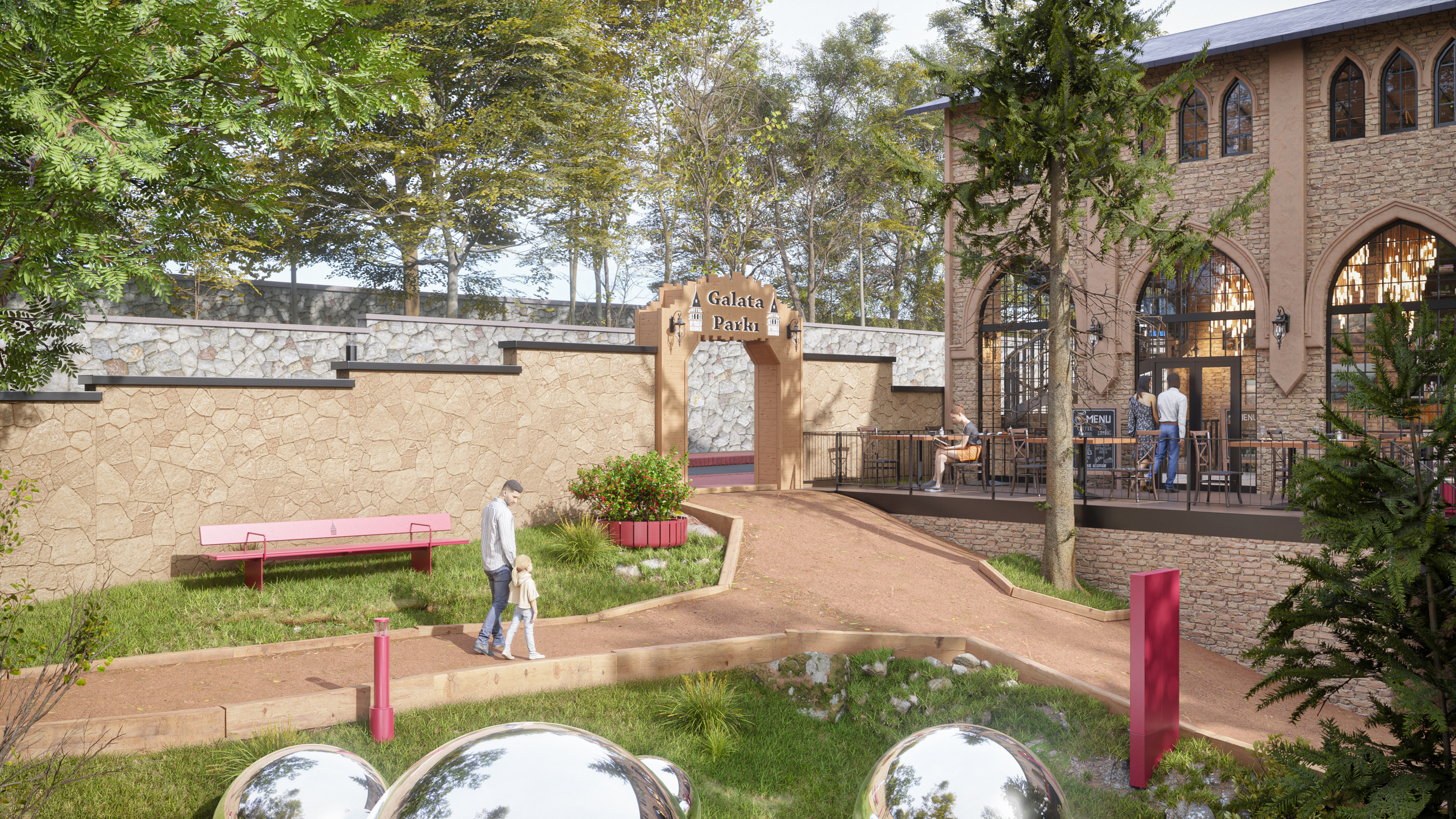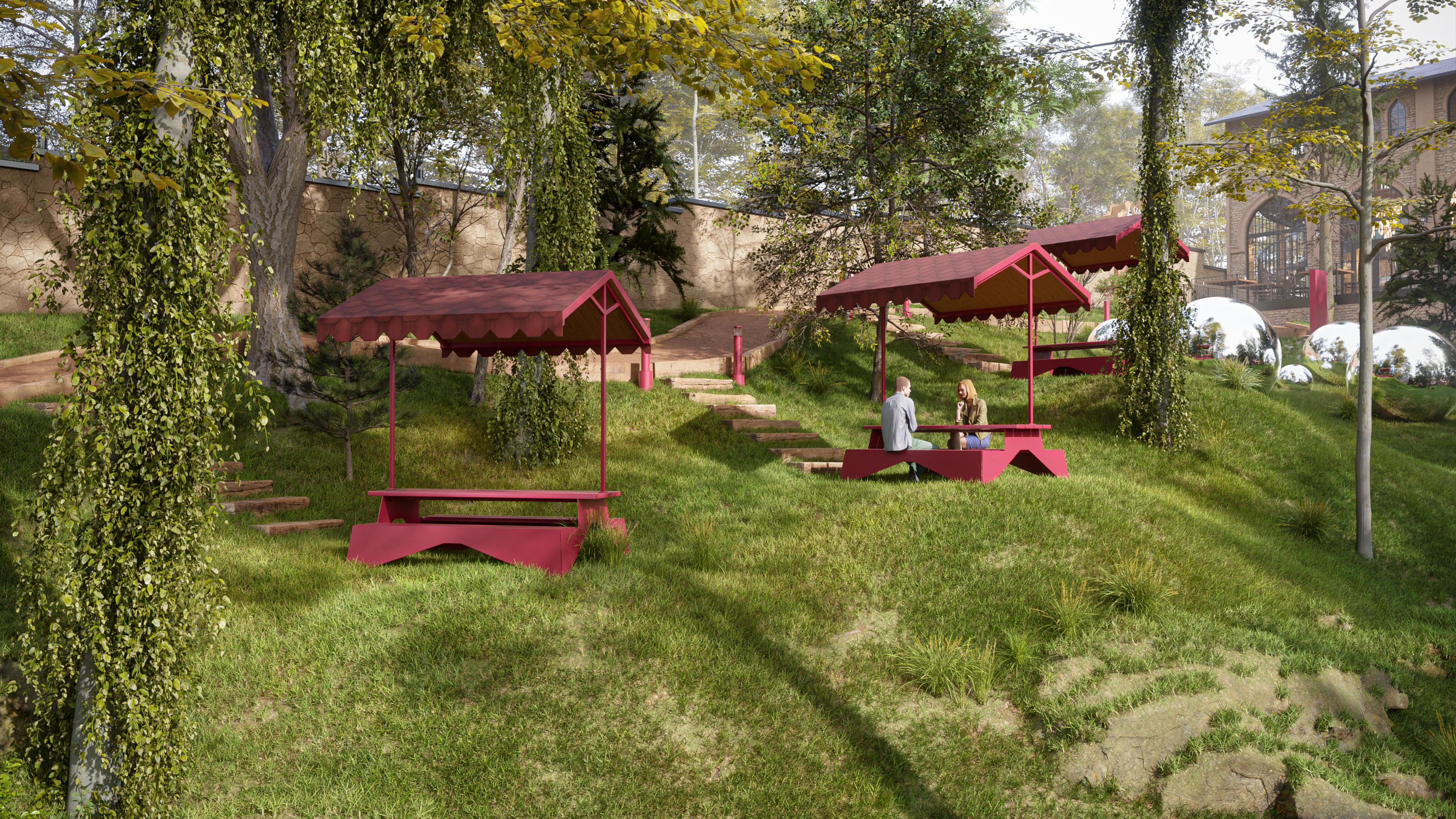 This project was designed to be built within a wooded park in the Beyoğlu district of Istanbul, without harming the natural environment or cutting down any trees. It consists of spaces where people of all ages can enjoy their time including a social facility, library, cafe, a small waterfall, an artificial pond and stream, walking paths, gazebos, picnic areas, a playground, and benches scattered throughout the park.