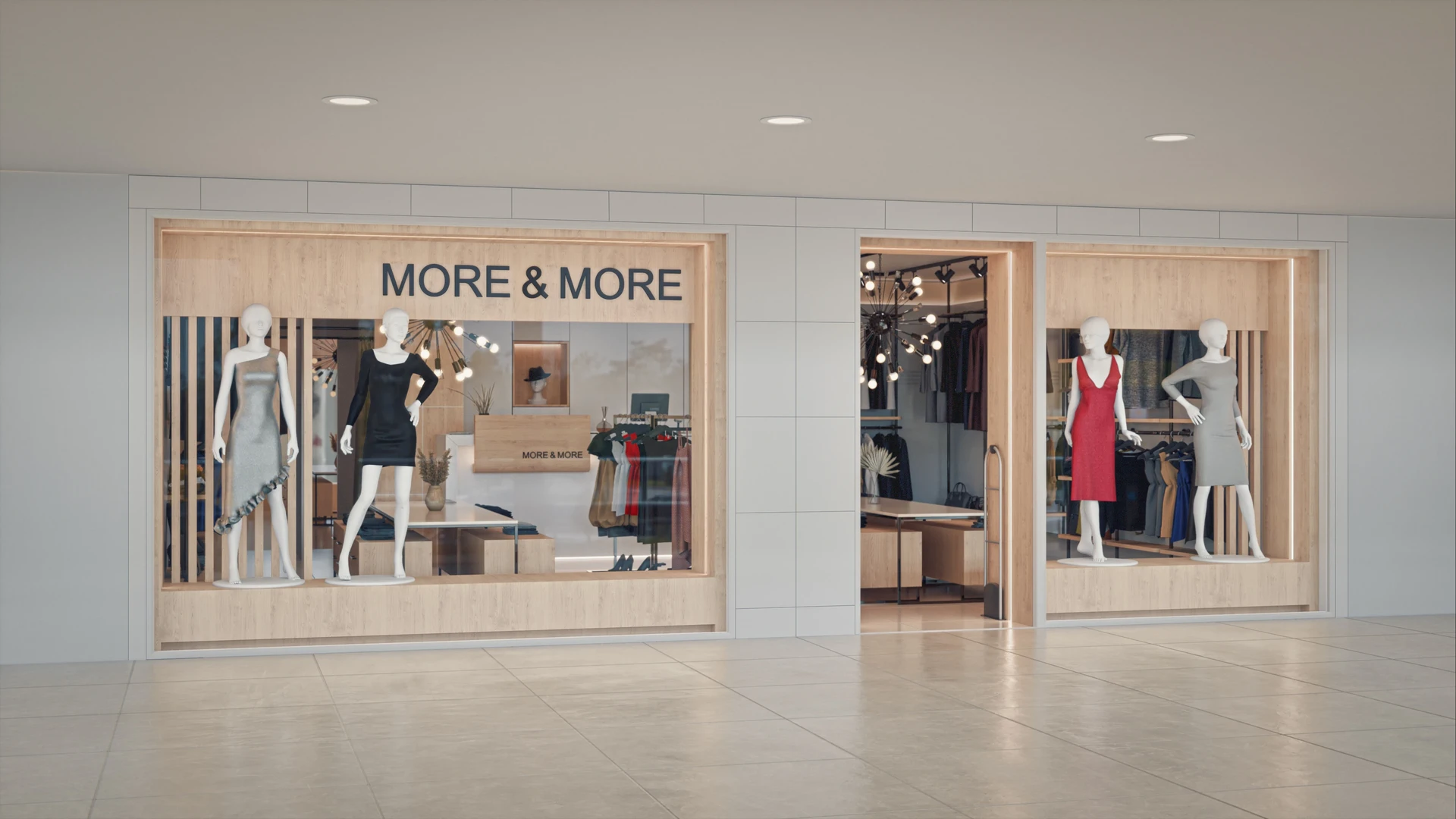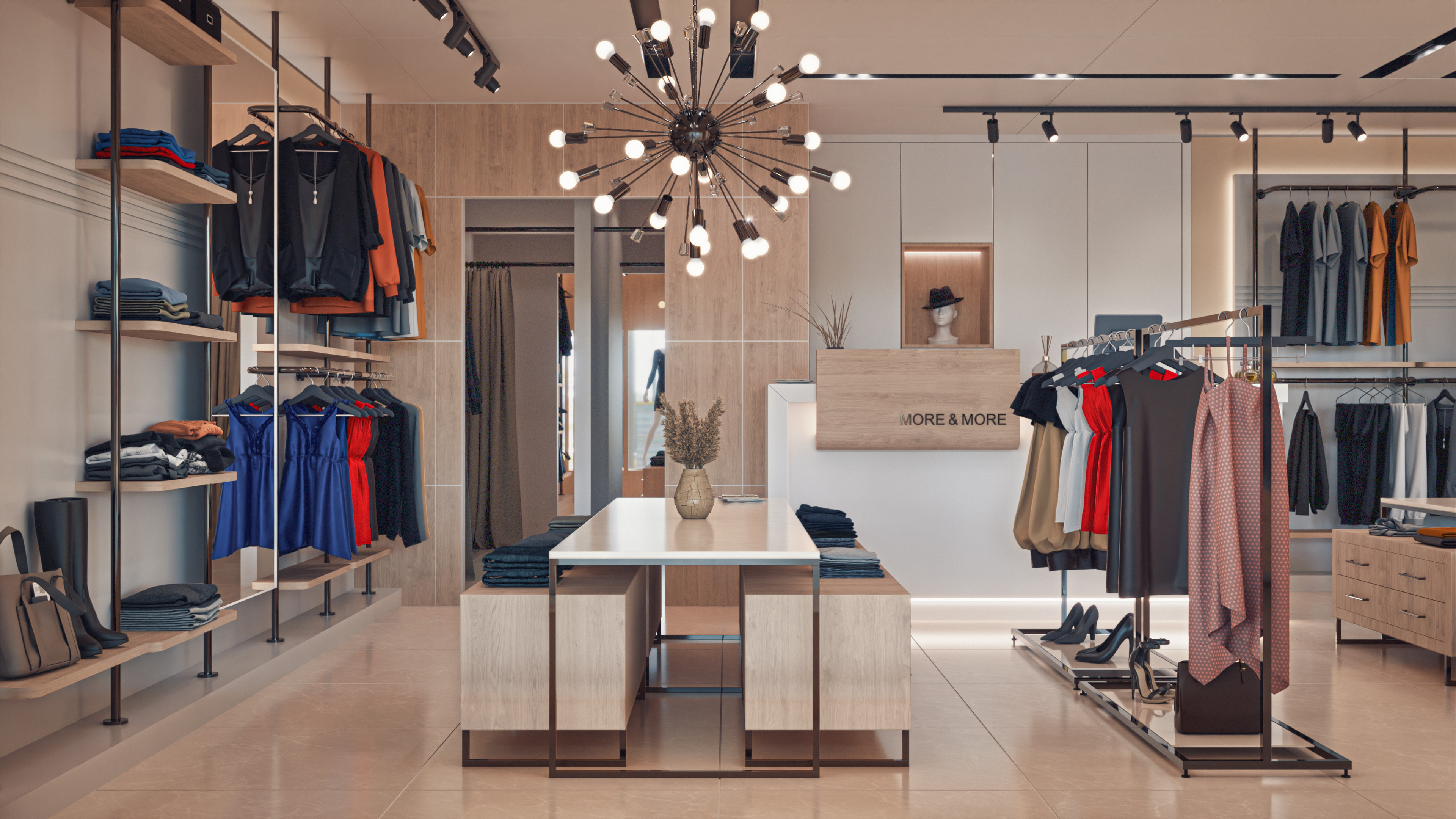 This project was designed for one of the retail stores of a fashion brand. The space includes storage, fitting rooms, and a stylish display area that together create a comfortable and elegant shopping experience. Warm lighting, soft colors, and natural materials were used to highlight the clothing and give the interior a modern yet inviting feel.