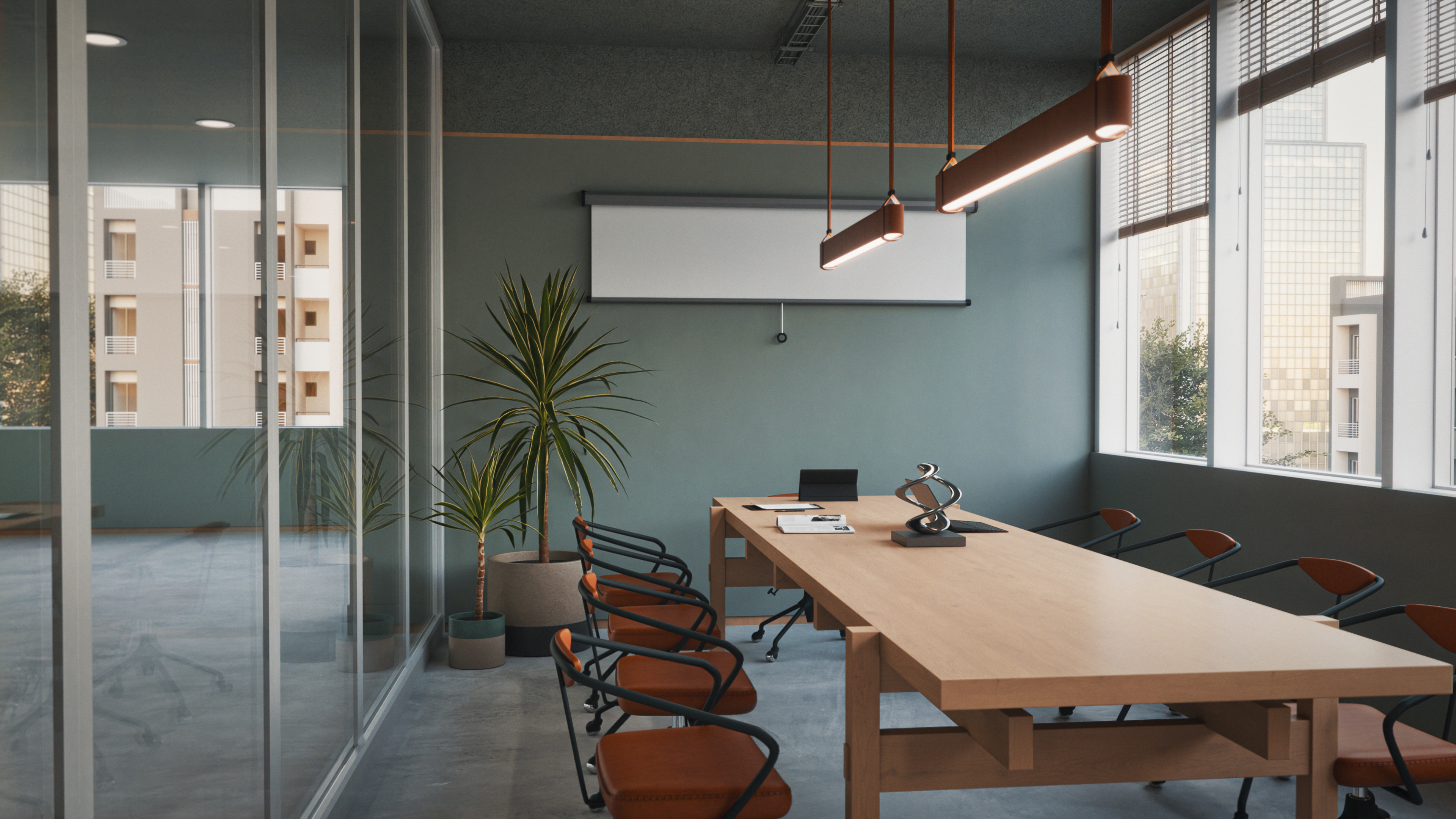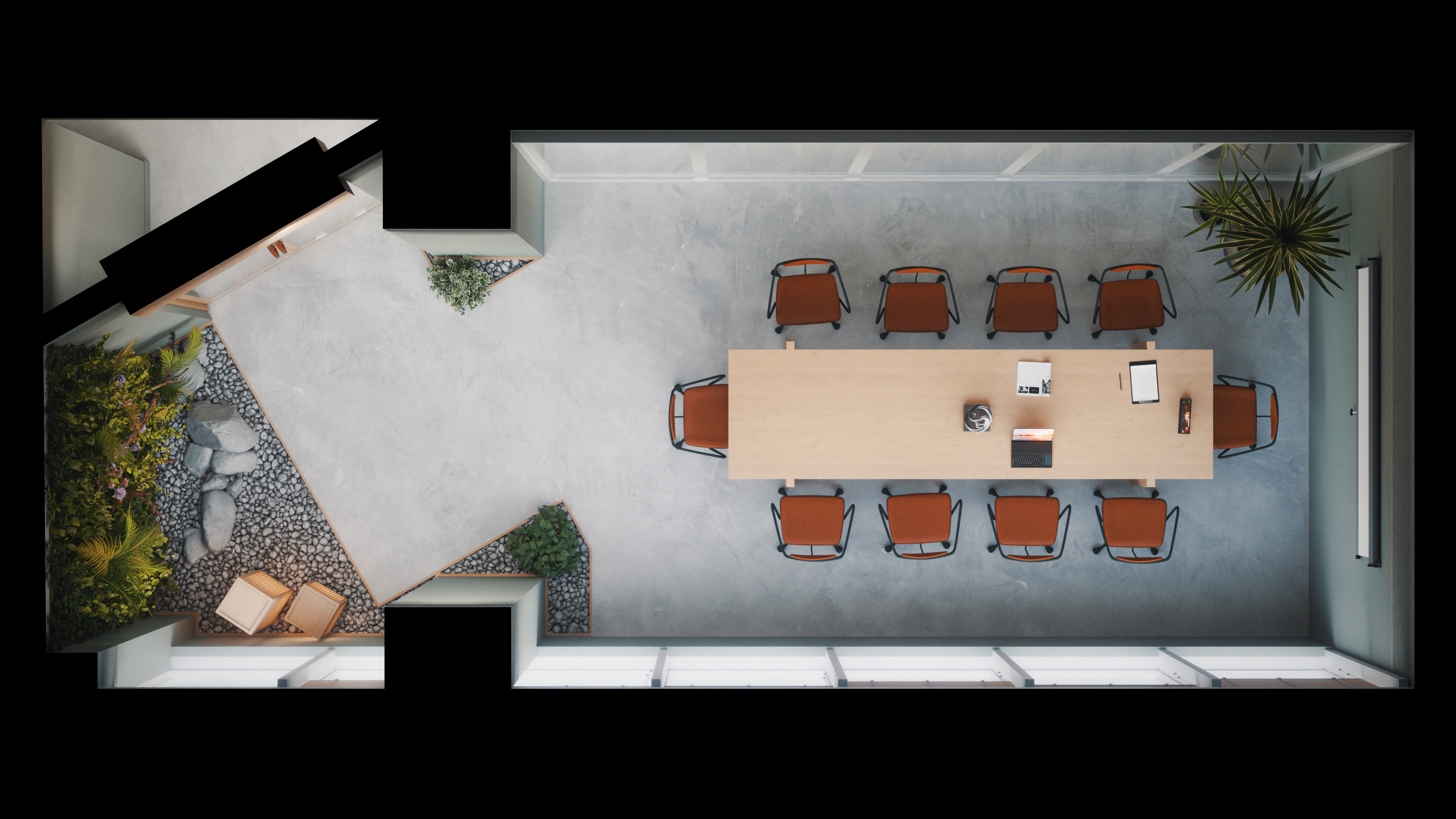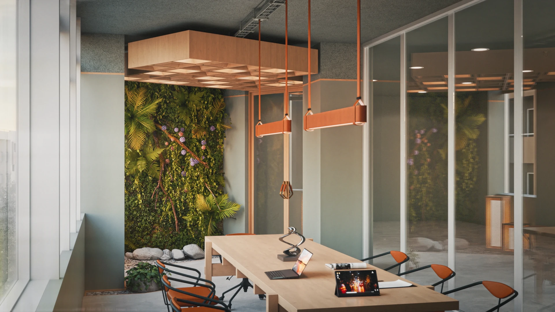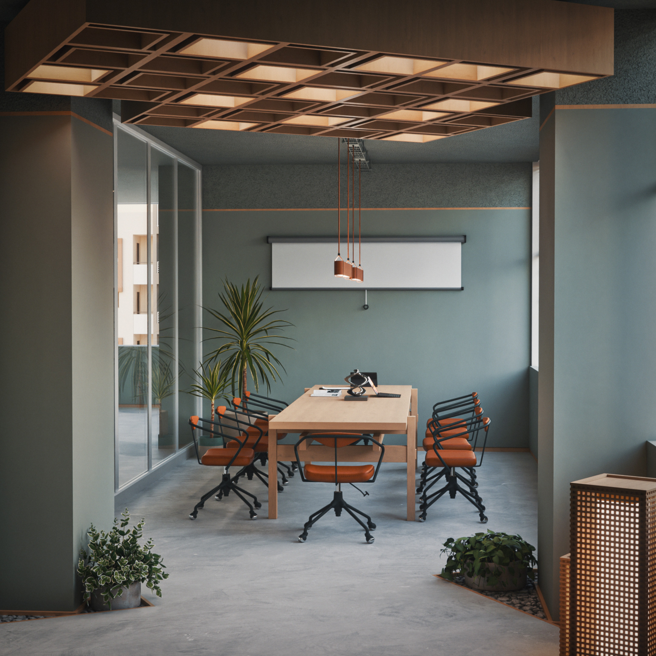 This meeting room was created for a large textile company. It’s tucked away inside a multi-story complex, offering a quiet and private space for important conversations. Soundproof glass keeps the room calm and focused, while the design takes inspiration from nature to bring a softer, more relaxed atmosphere to serious meetings.