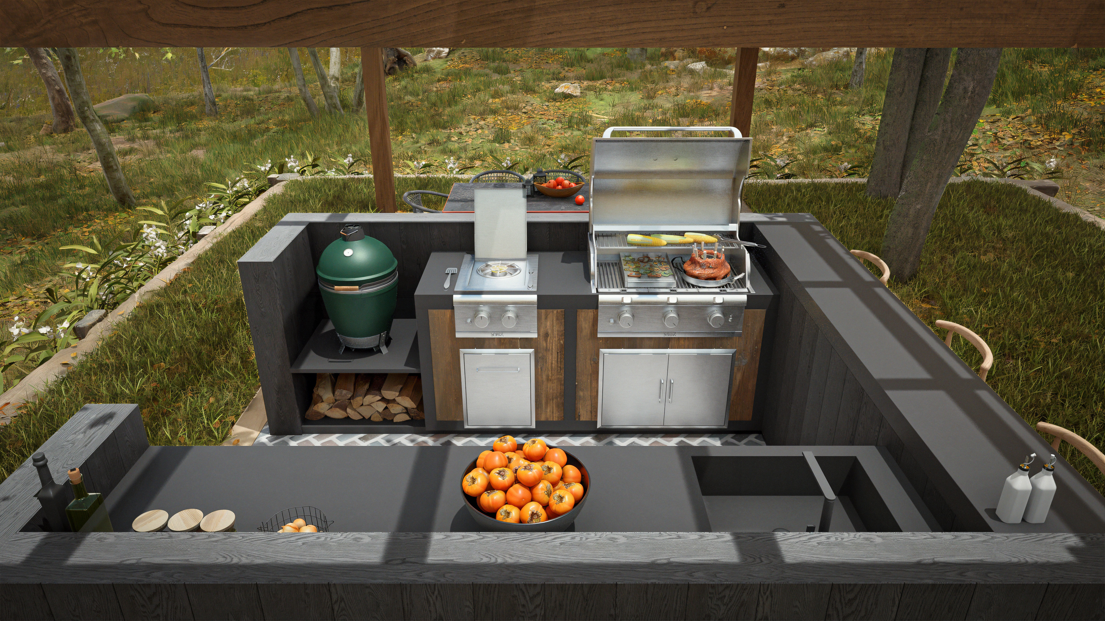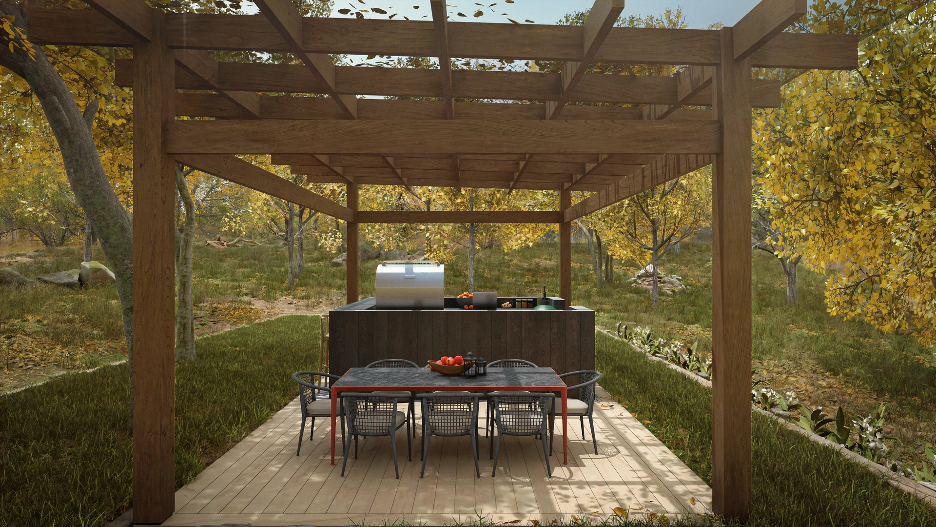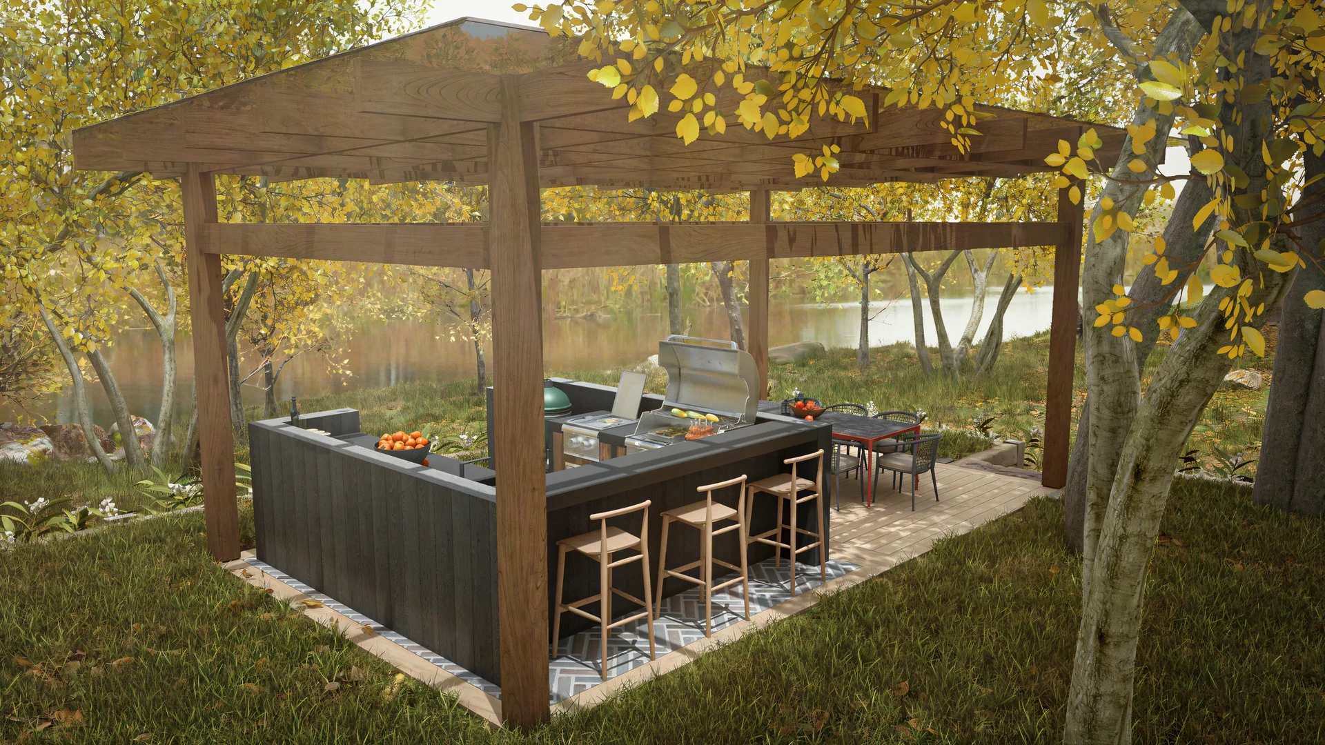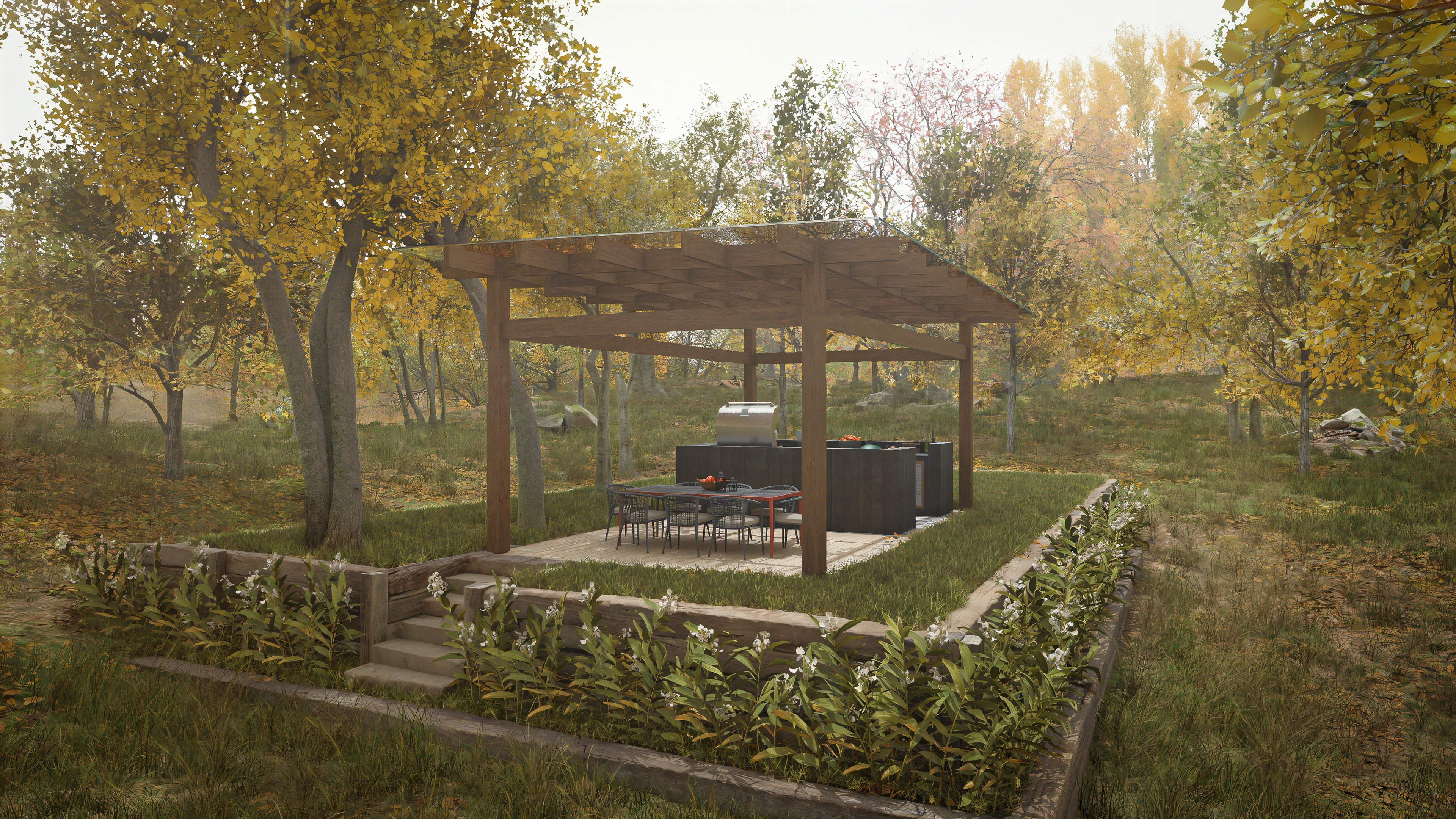 This project was designed for a riverside barbecue area located in the spacious backyard of a house surrounded by nature, set at a distance from the main building.